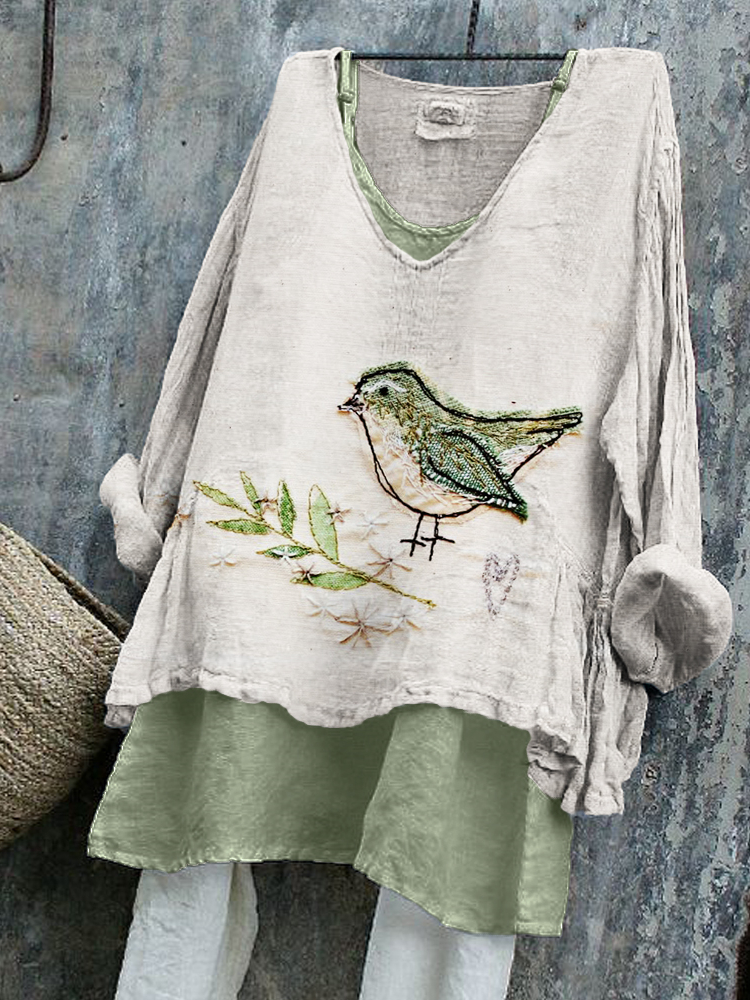 Bird & Leaves Floral Fiber Art Linen Tunic