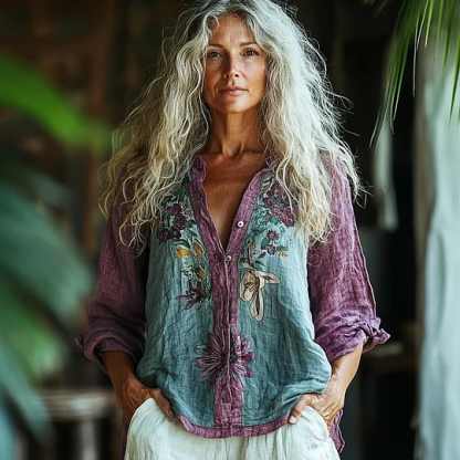 Bohemian Style Linen Floral Art Print Long Sleeve Shirt