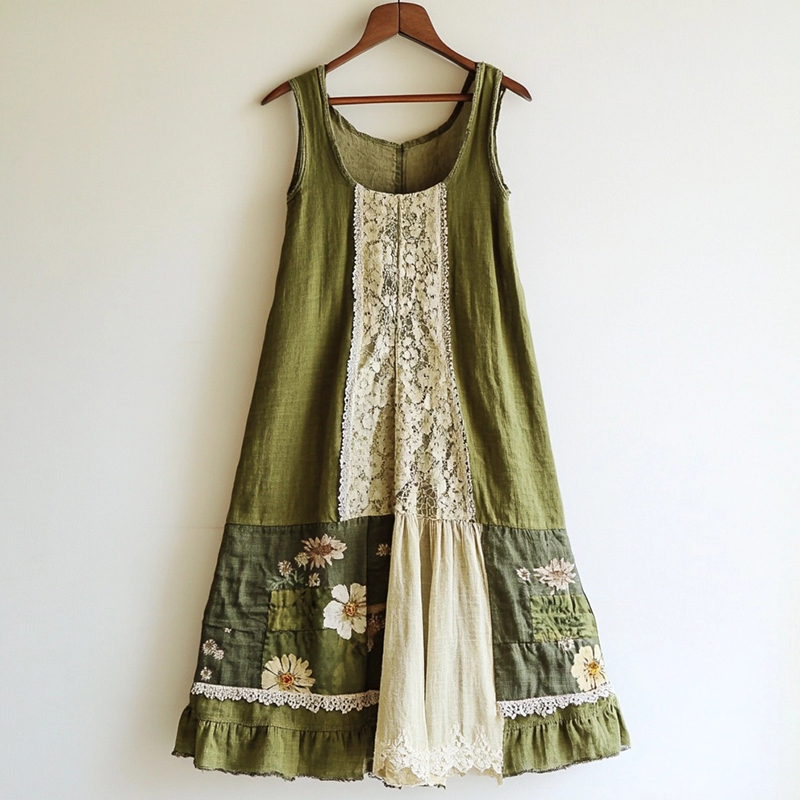 Boho Floral Pattern Linen Lace Patchwork Dress 6844