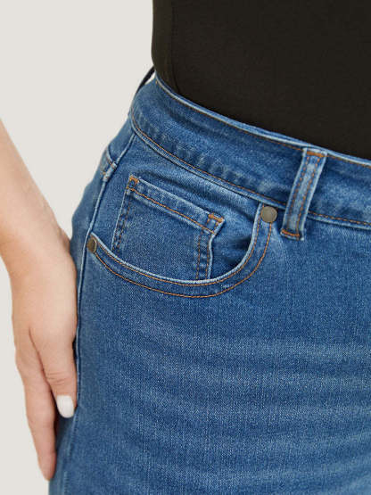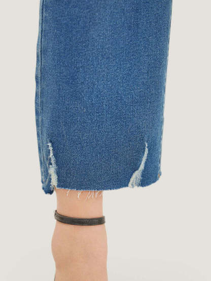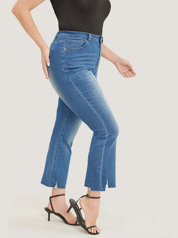 Bootcut Very Stretchy High Rise Medium Wash Distressed Hem Jeans