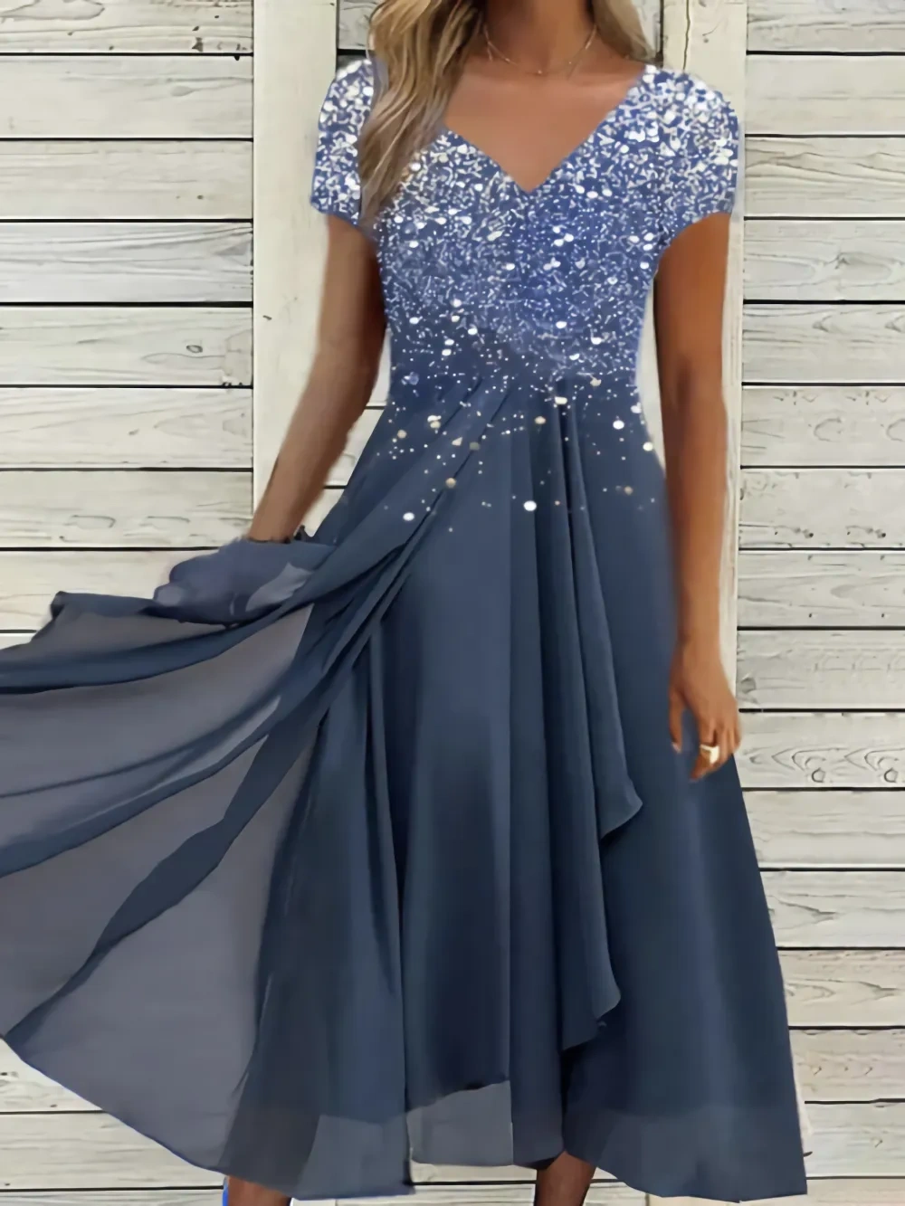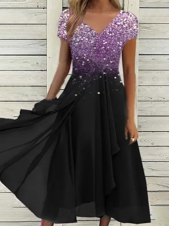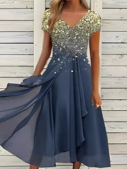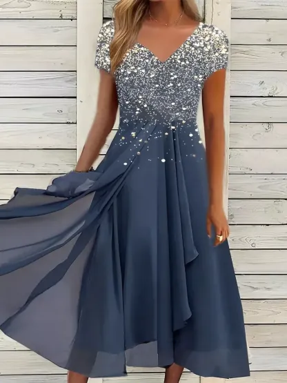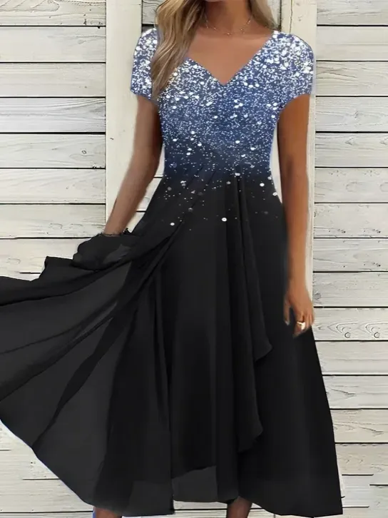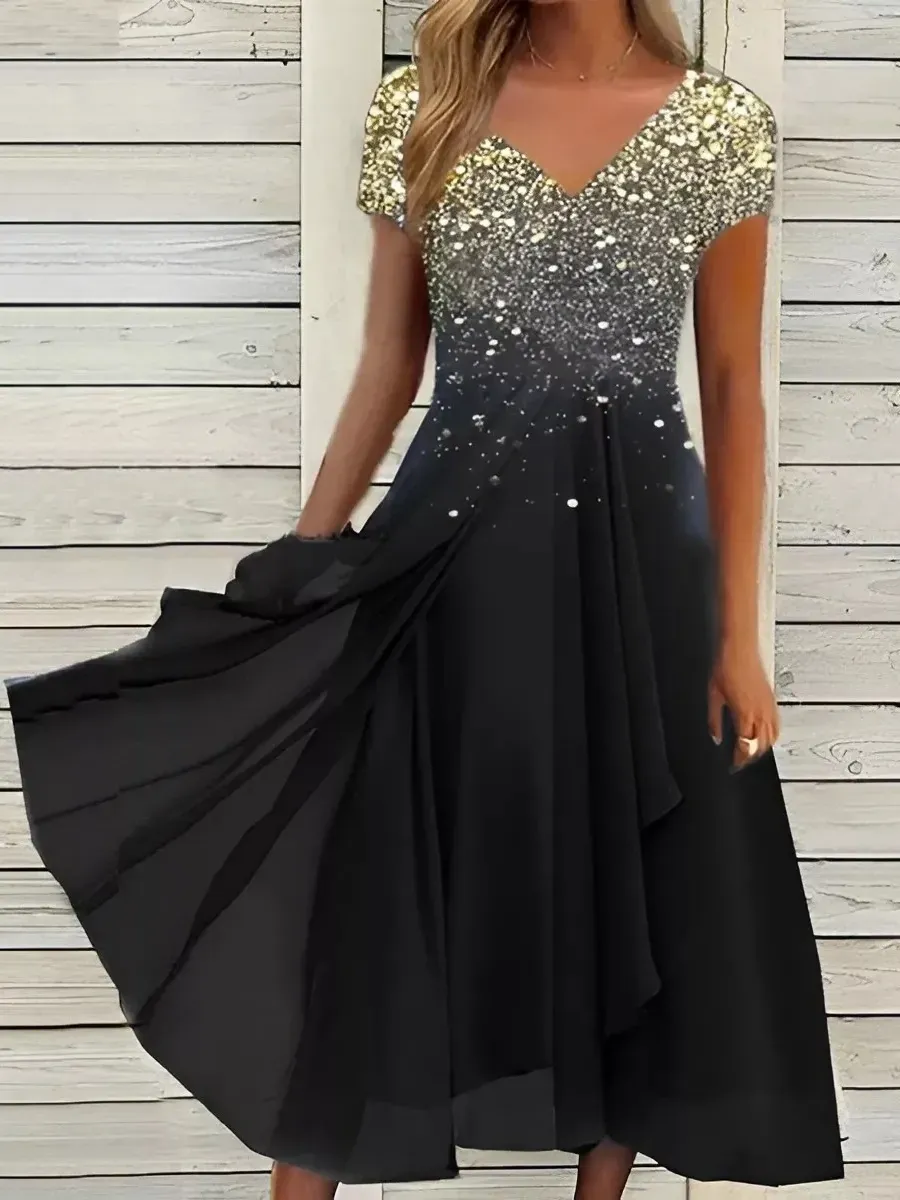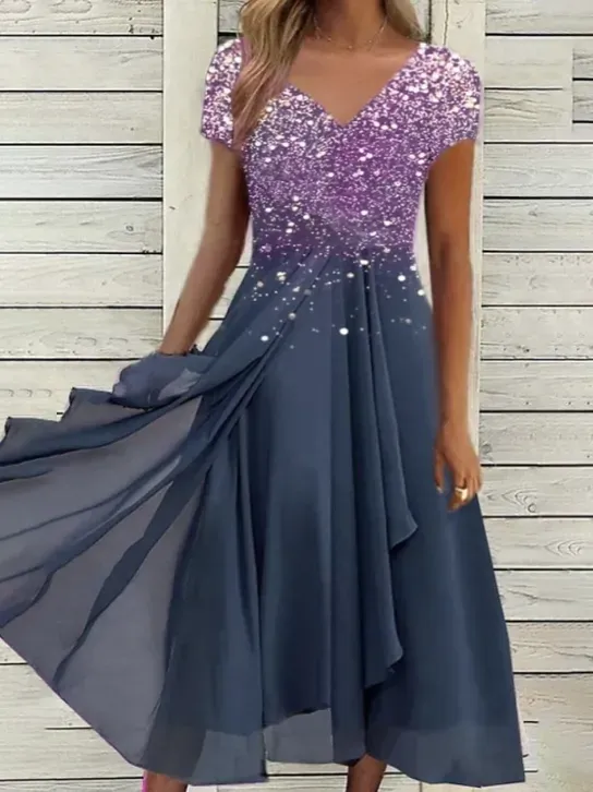 Casual Bronzing Printed Chiffon Panelled V-Neck Short-Sleeved Midi Dre