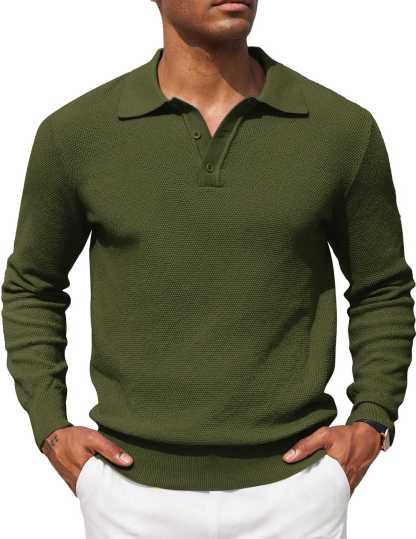 Polo collar, 3 button closure, unique waffle weave pattern, classic solid color, high elastic banded cuffs and hem