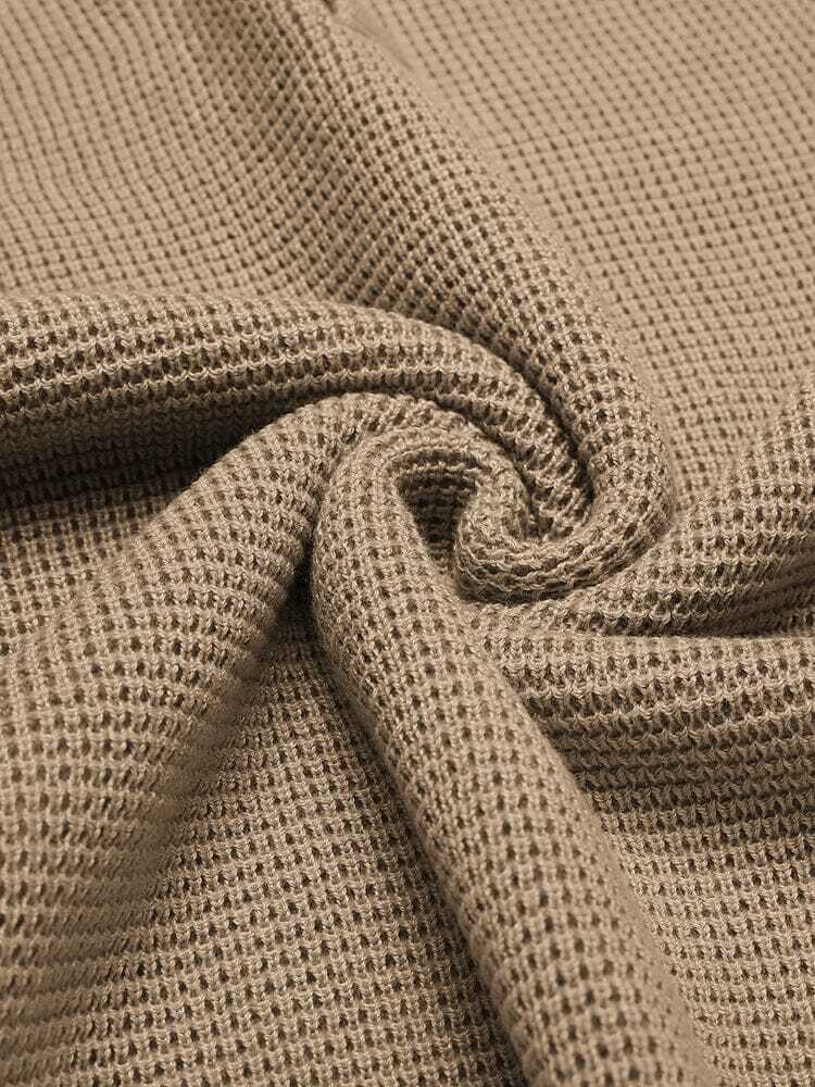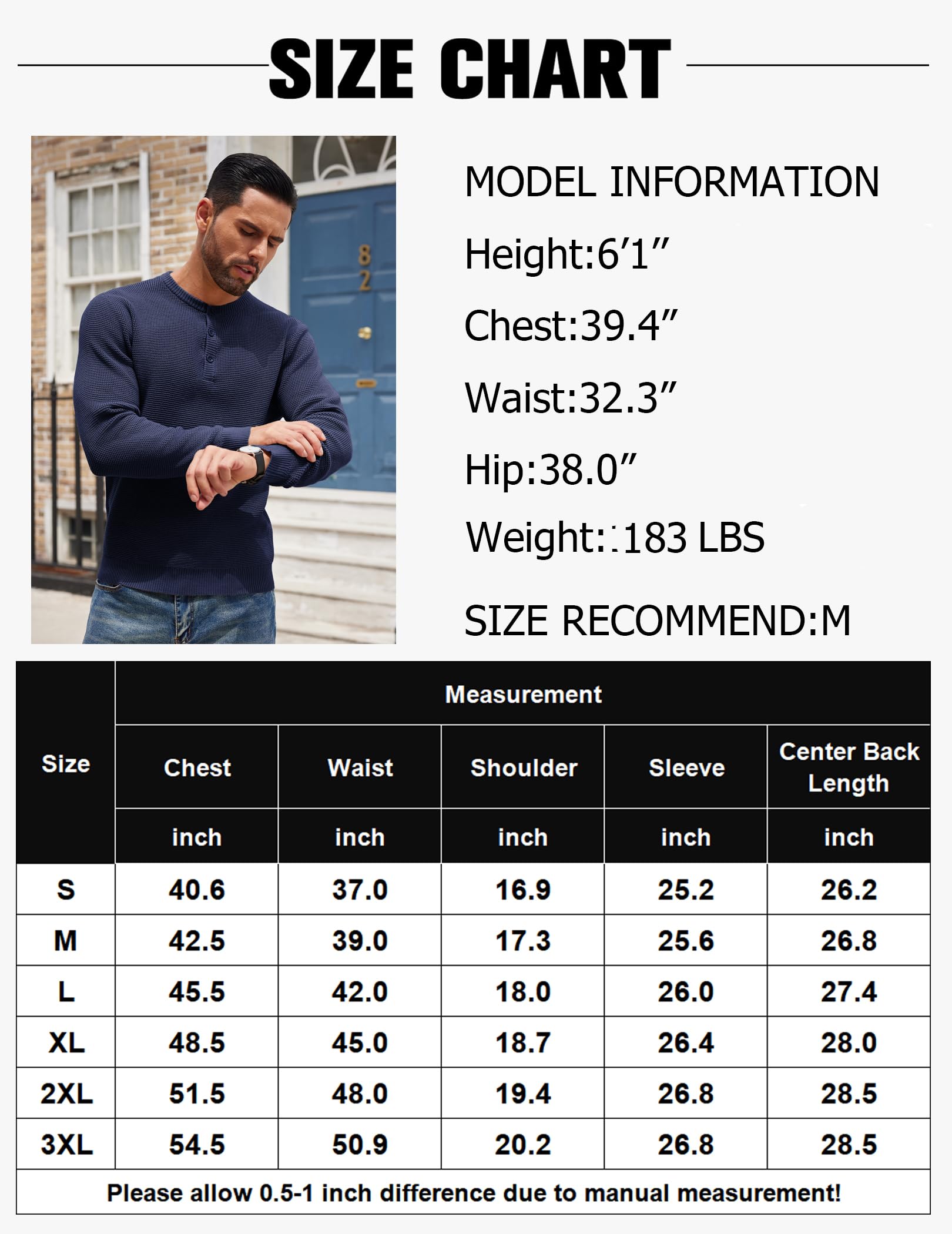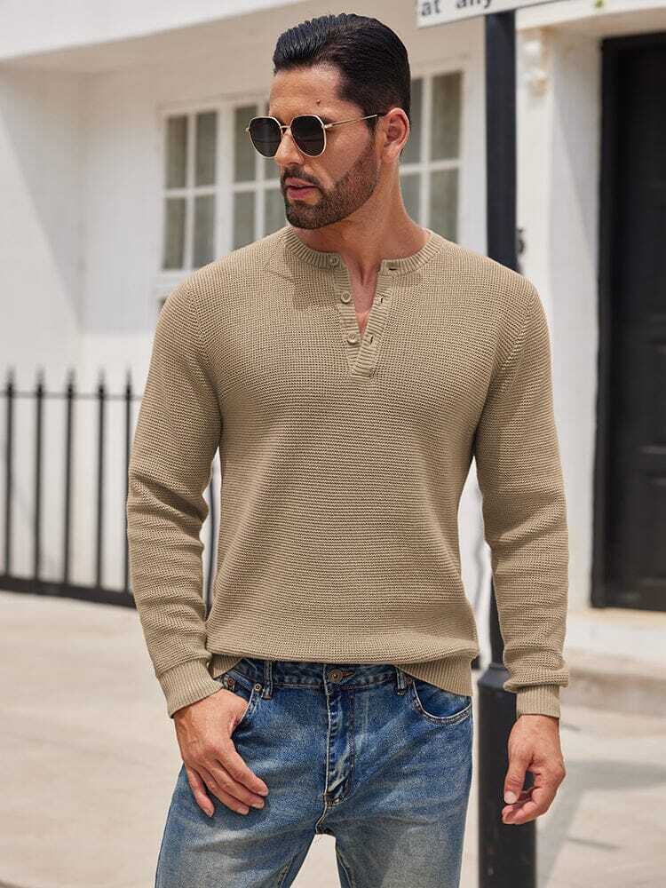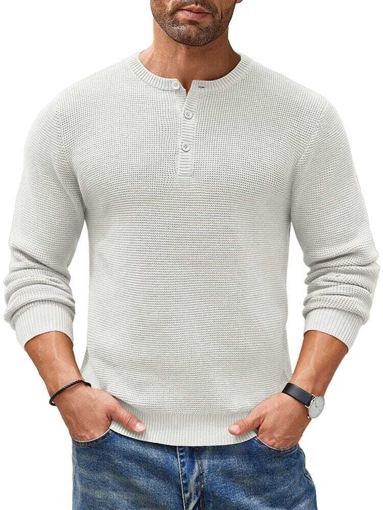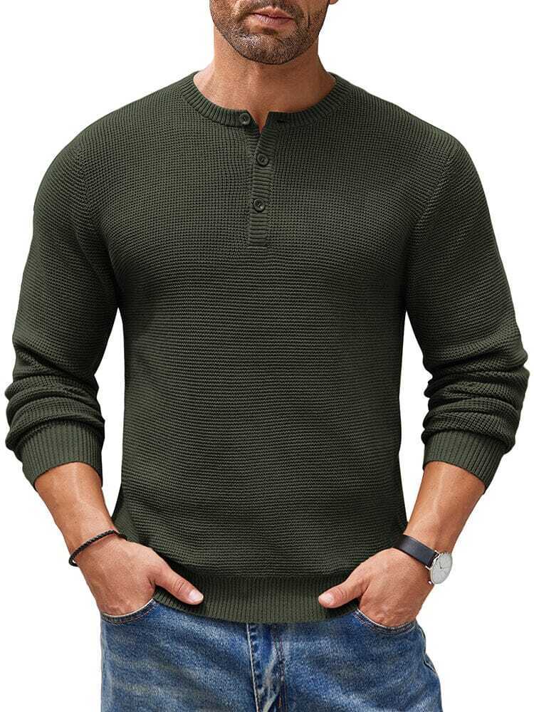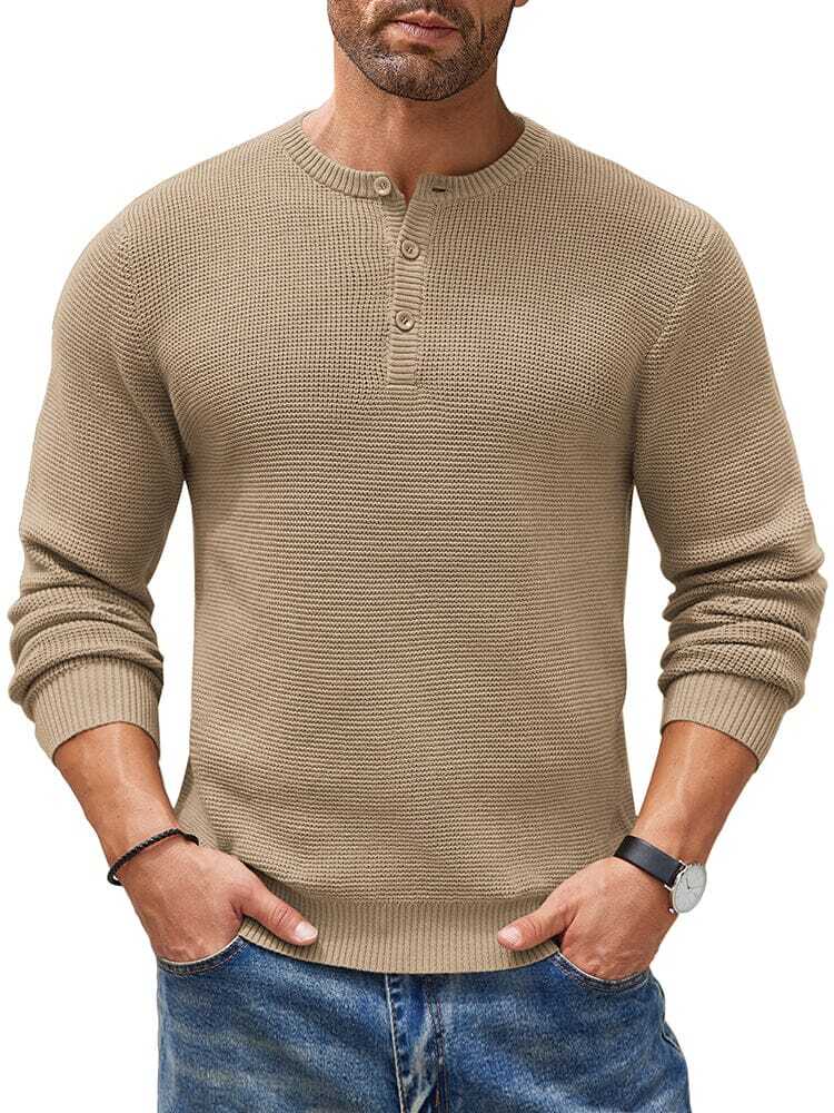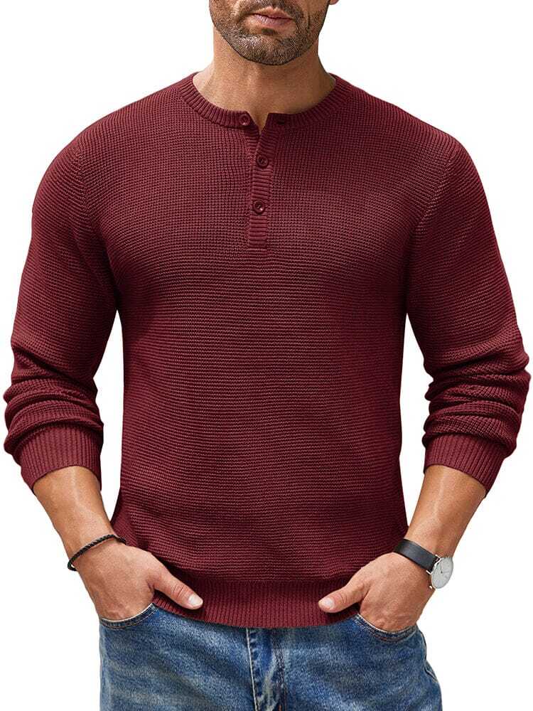 Classic henley neckline, 3 button, long sleeves, solid color, waffle textured, ribbed knitted cuff & hem