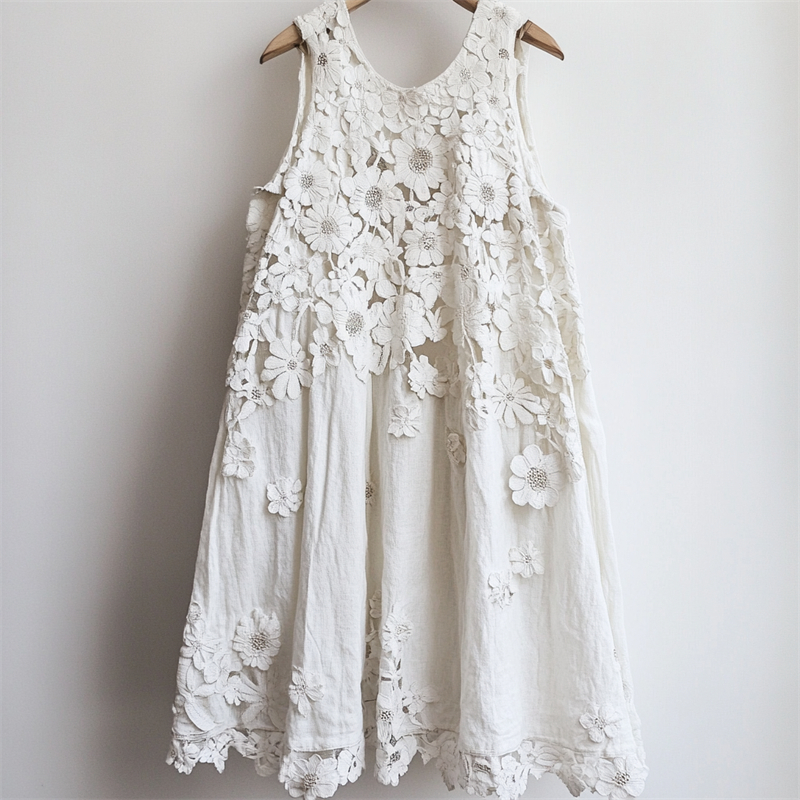 Classy 3d Floral Hollow Lace Patchwork Linen Tank Dress