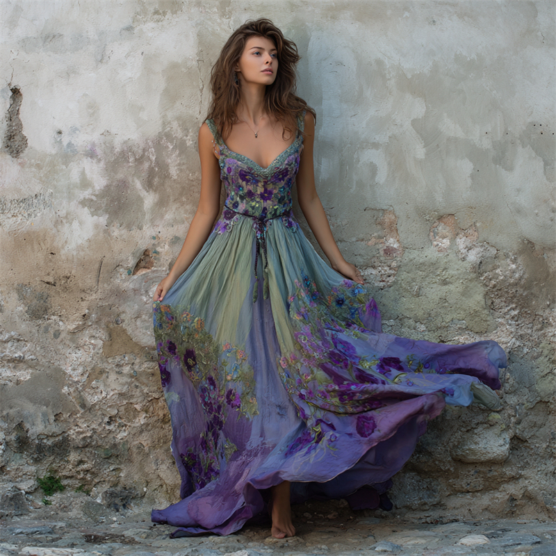 Classy Floral Embroidered Purple Gradient Flowy Linen Maxi Dress
