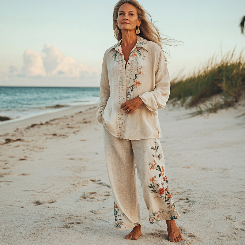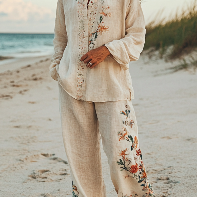 Comfort Vacation Oversized Linen Long Sleeve Shirt and Wide Leg Pants 7f28