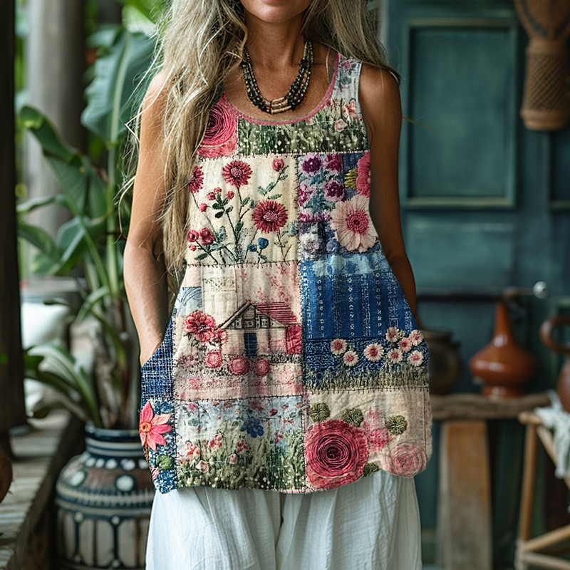 Cottage Floral Patchwork Fiber Art Linen Tank Top 3711