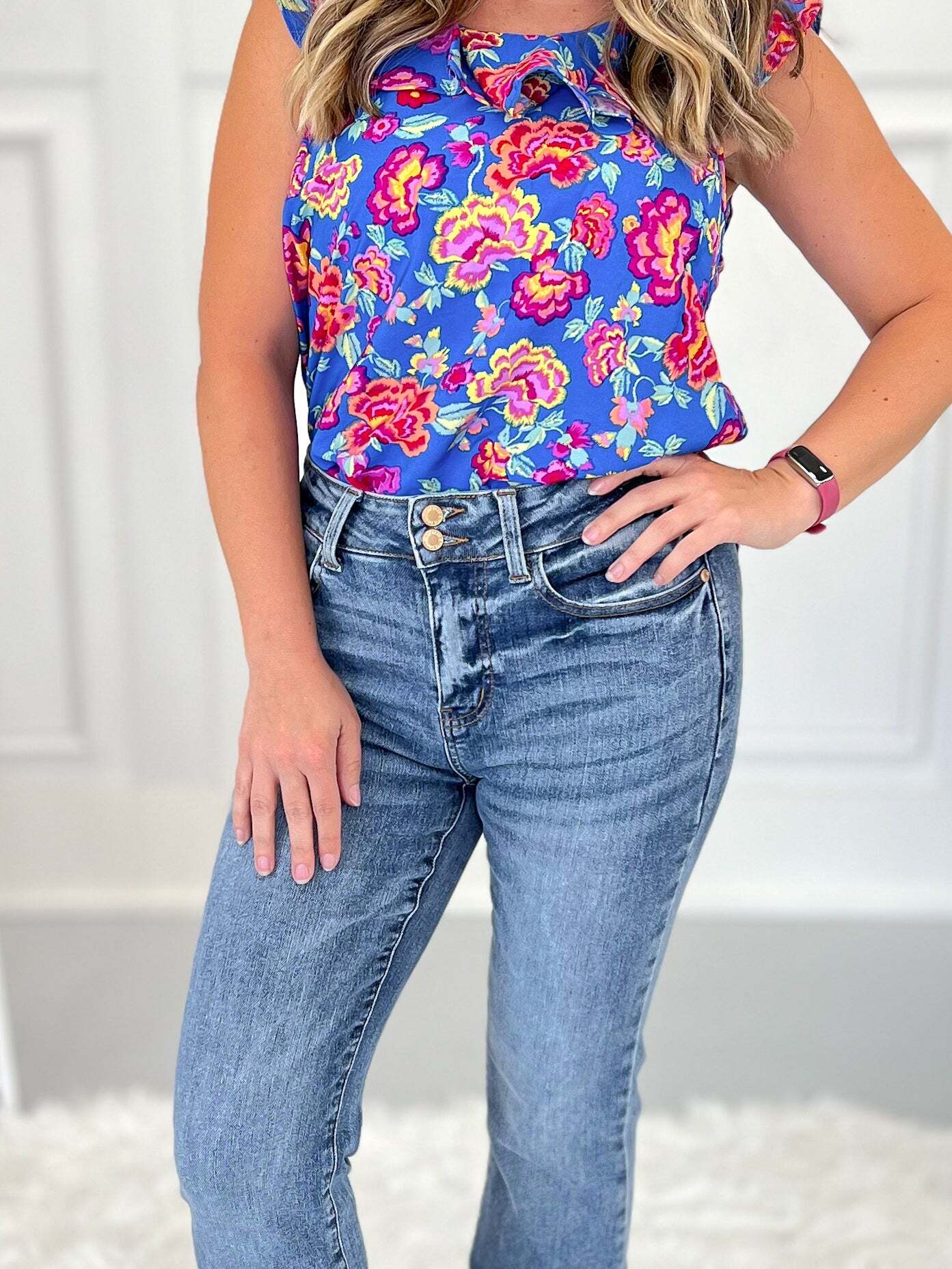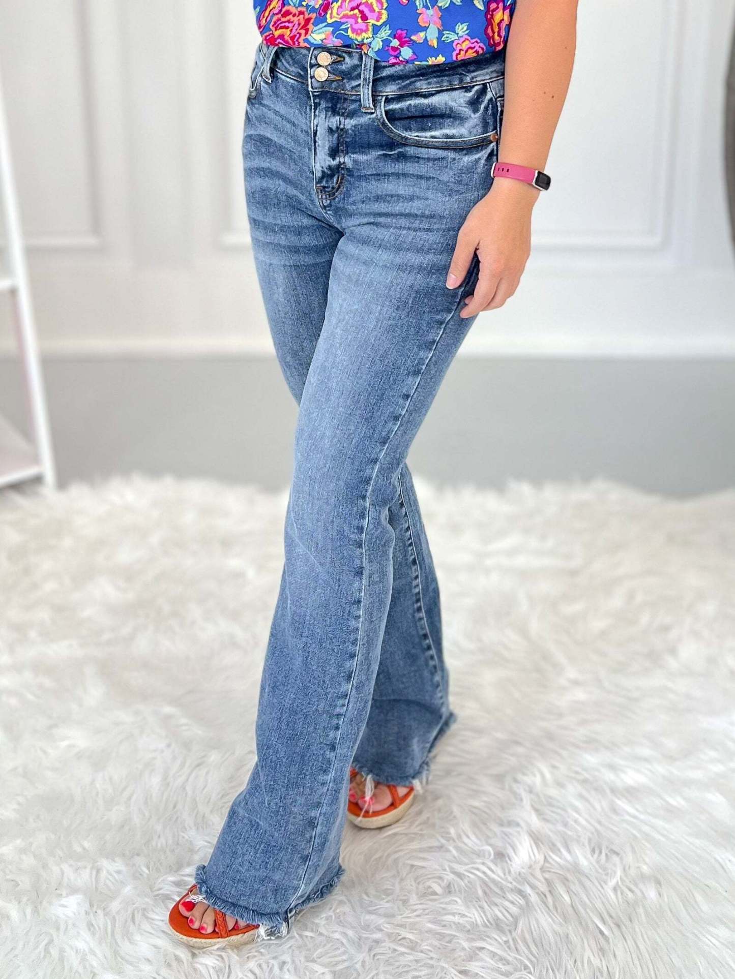 The BEST ever bootcut jean by Judy Blue is finally back in stock after two long years! These are the ultimate in stretch, comfort and style! The double button and wider waistband give a snatched look at the waist while the high contrast grain and sanded thighs make everyone look like a million bucks. They mold and fit like a glove! No distressing = work place approved too!