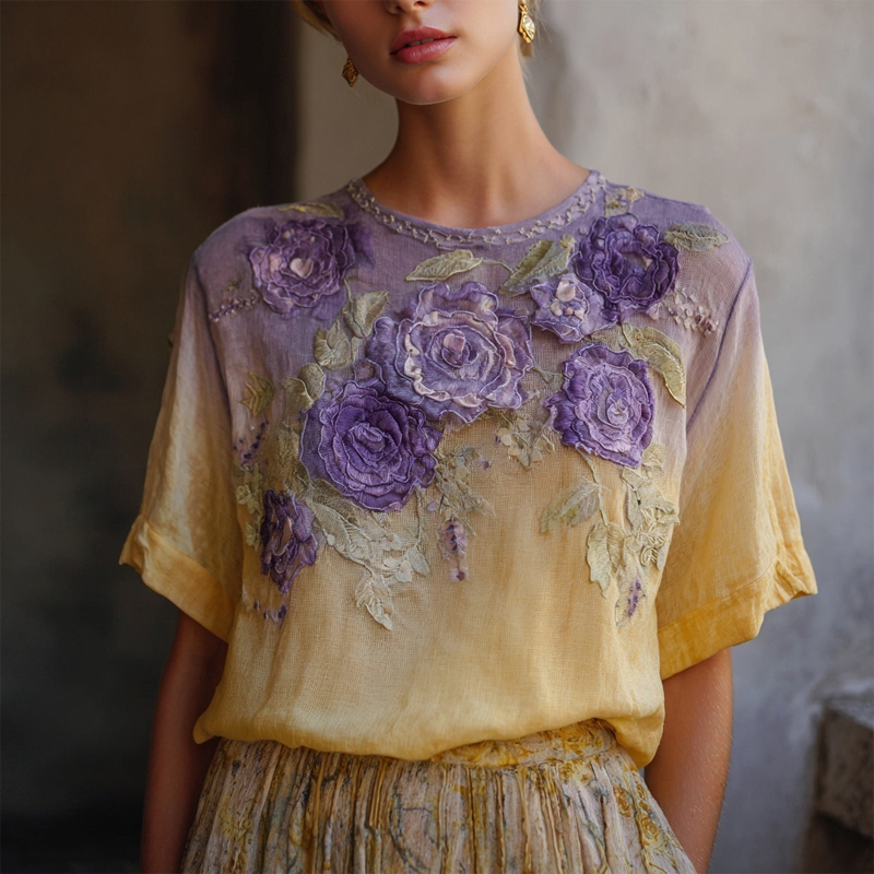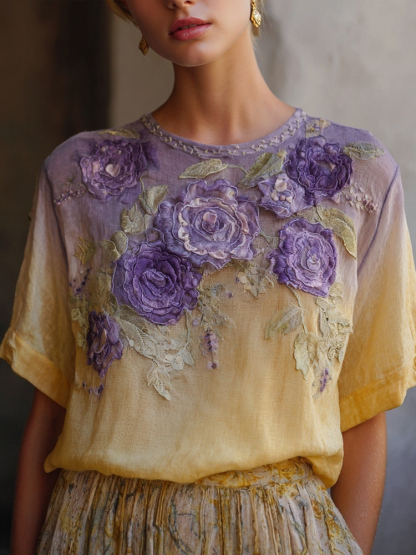 Elegant Boho Purple Roses Embroidered Gradient Linen T Shirt