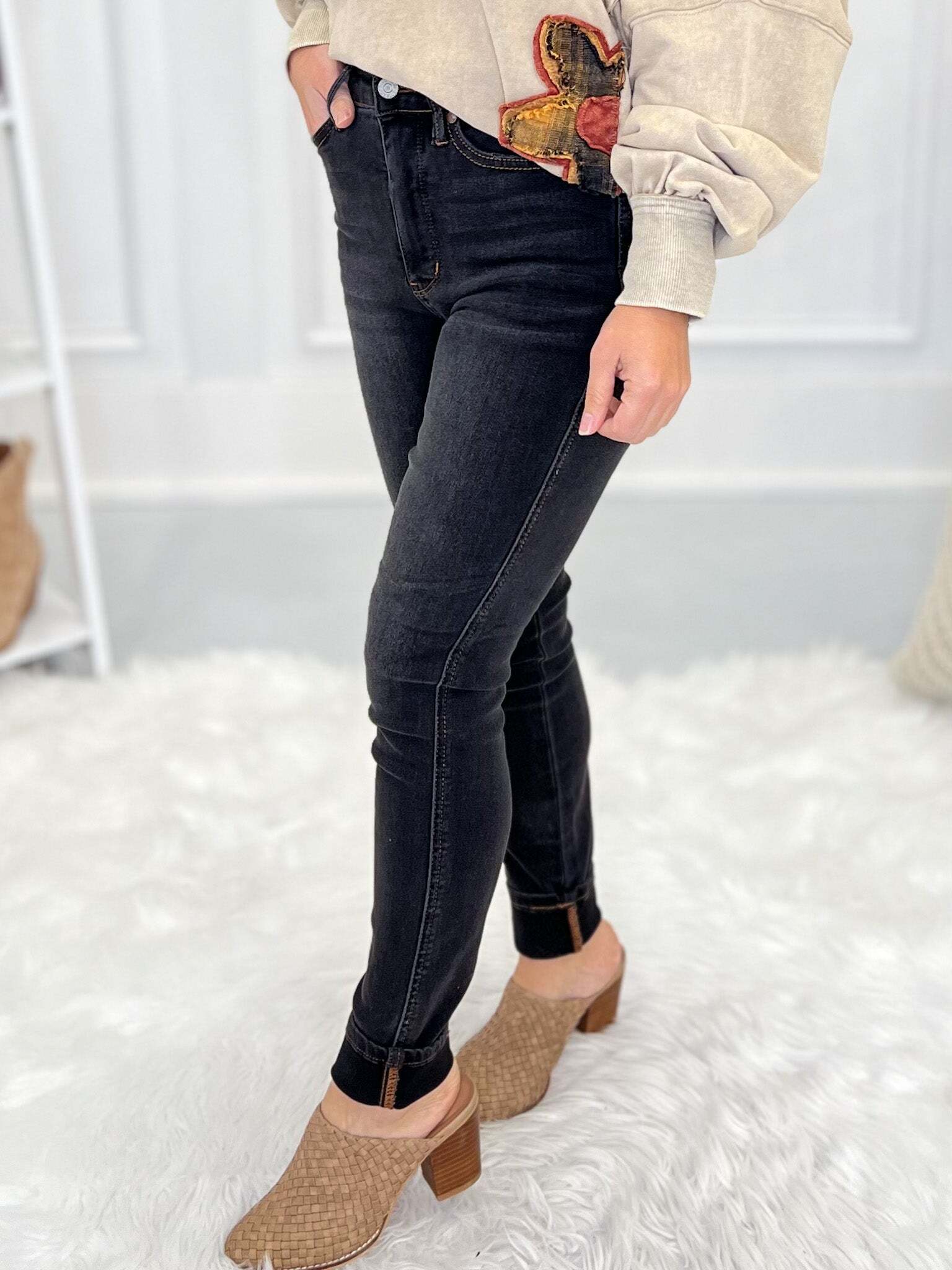 Judy Blue has made this jean in several silhouettes and they are always perfection! This is the first time we've had the in a skinny jean and Holy Moly! The fit is fantastic, the wash is stunning and we love that they have a moody vibe that is perfect for this season. The brown stitching really pops and gives these an instantly elevated look. Full of stretch and they also have a built-in, tummy control panel for a super slimming effect too!