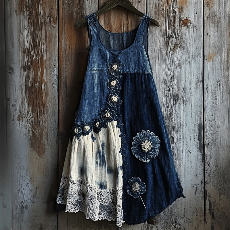 Floral Denim Textile Lace Hem Patchwork Tank Dress