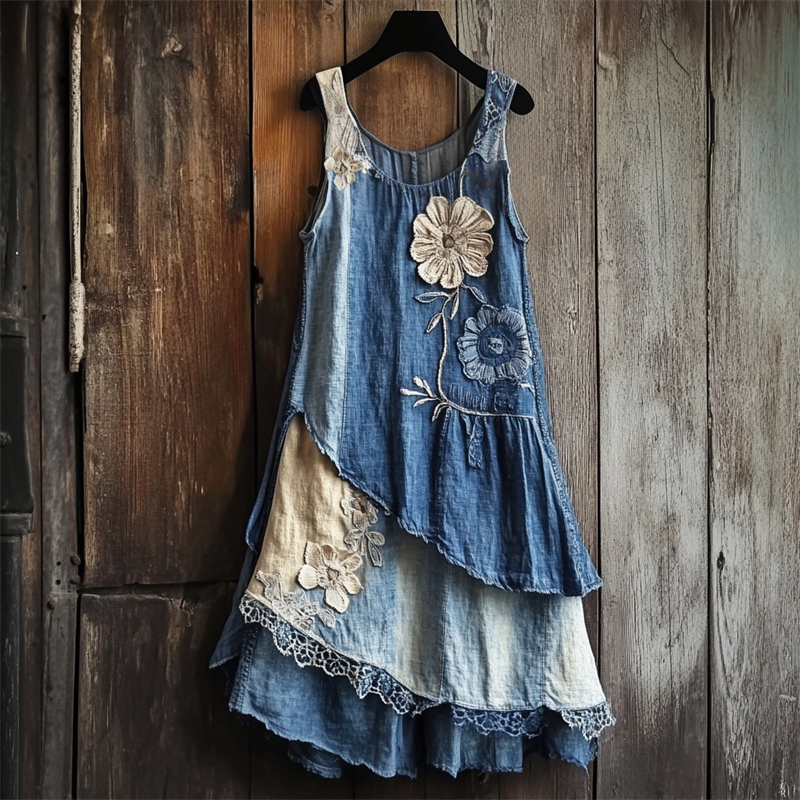 Flowers Denim Textile Lace Layered Tank Dress 3ead