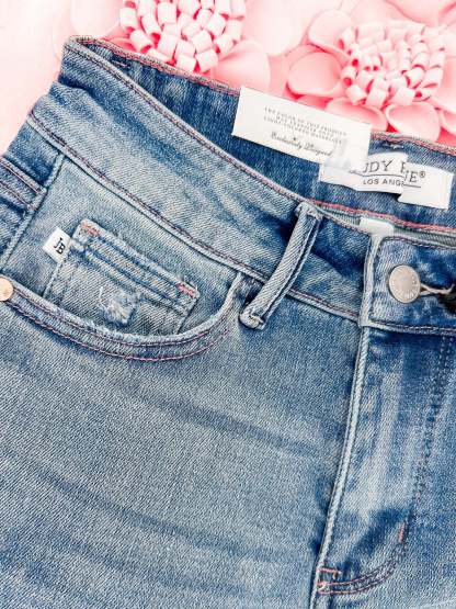 Do you see it?! That ROSE GOLD stitching! These Judy Blues are cream of the crop, absolute perfection! From the midrise fit, to the straight leg silhouette and the perfectly placed distressing at the bottom - it is so cute! These are perfectly stretchy, but with amazing recovery that bounces back and still holds it's shape for all day wear. These are so good... we bought Judy Blue out... you're welcome!
