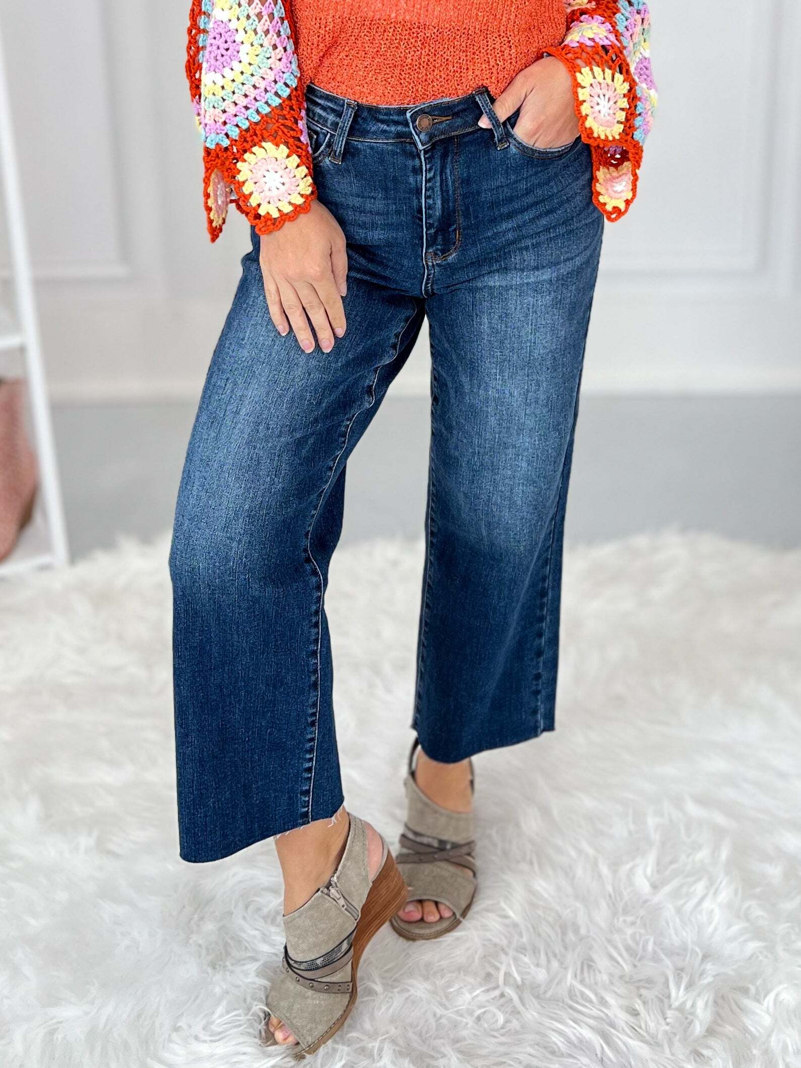 This brand new, cropped wide leg is an absolute must - packed with all of our favorite features of Judy Blue denim! The crisp, dark wash has that high intensity graining that we love from Judy Blue without having any distressing so you can style the for just about any occasion. The stretch is unreal, but still bounces back and holds it's shape wear after wear. These are so dang good, you might want two!