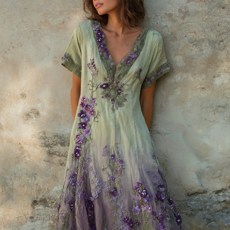 Purple Floral Embroidered Gradient Vintage Linen Maxi Dress