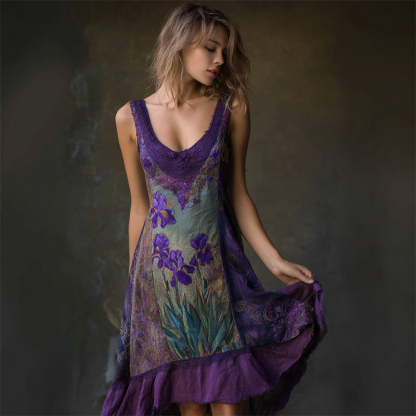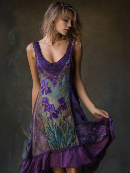 Purple Irises Embroidered Lace Patchwork Flowy Linen Dress
