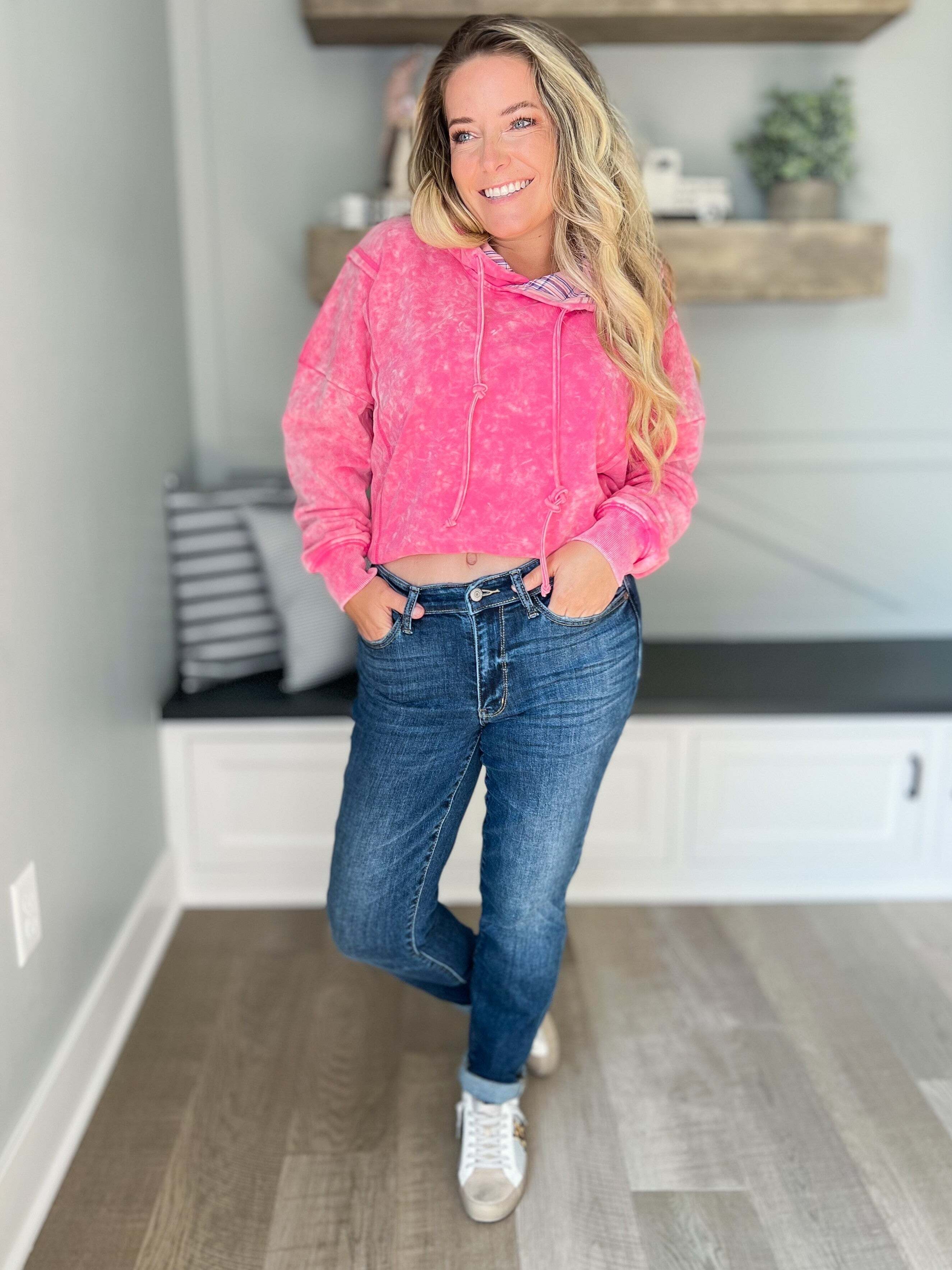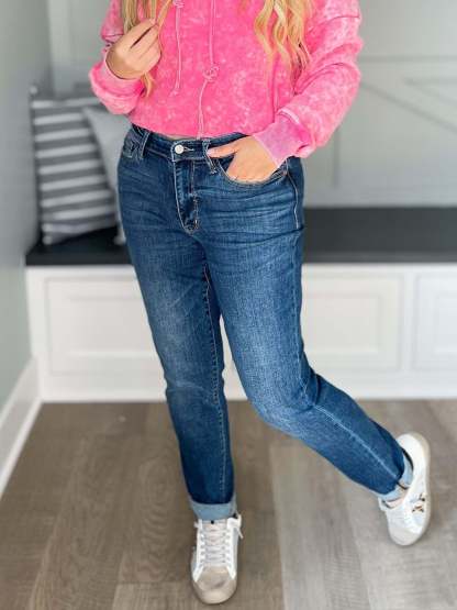 The PERFECT every day, "look cute with no fuss" pair of jeans and our most requested style... non-distressed boyfriend jeans! These feature a gorgeous dark wash and grain, with that delish Judy Blue stretch and comfort that everybody goes crazy for! If you see your size in stock, grab them! They sell out fast every time we have these beauties.