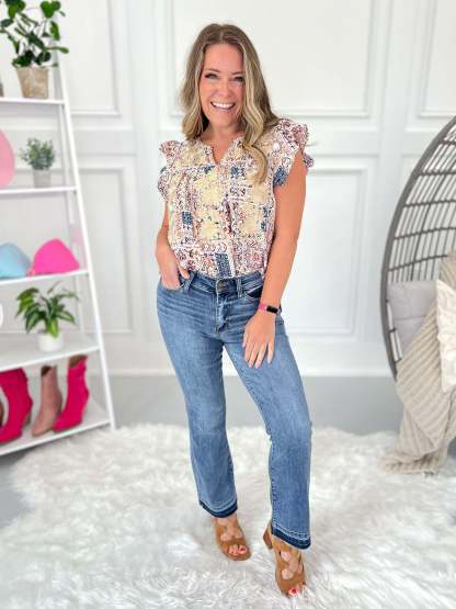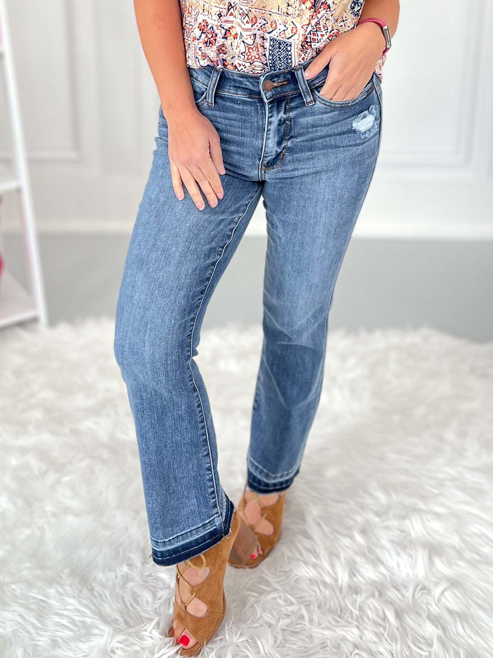 Cropped bootcuts, kick flare... whatever you want to call them, they are all the rage in the denim world because they are so dang good on everyone! They flatter your figure, balance your shape, and have a more playful and wearable length than a traditional bootcut gives. This pair has the cutest shadow hem detail and contrast on the back pockets to lift and round the booty. Talk about a sexy pair of jeans you can wear year-round! OH and of course they are full of stretch for that Judy Blue comfort we love!