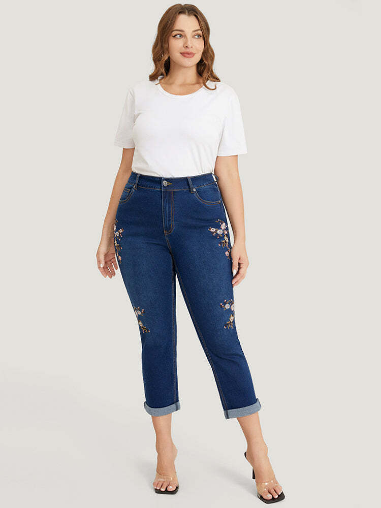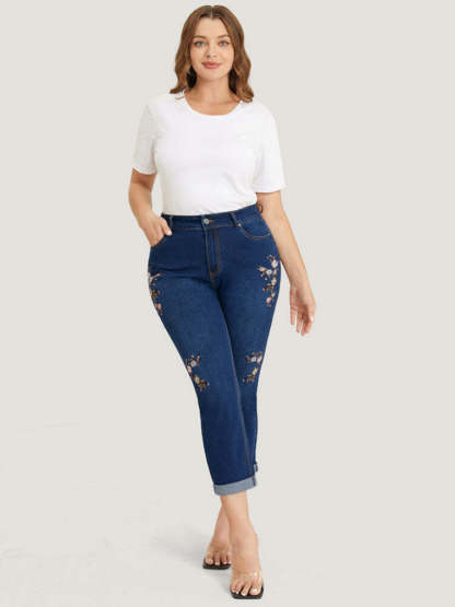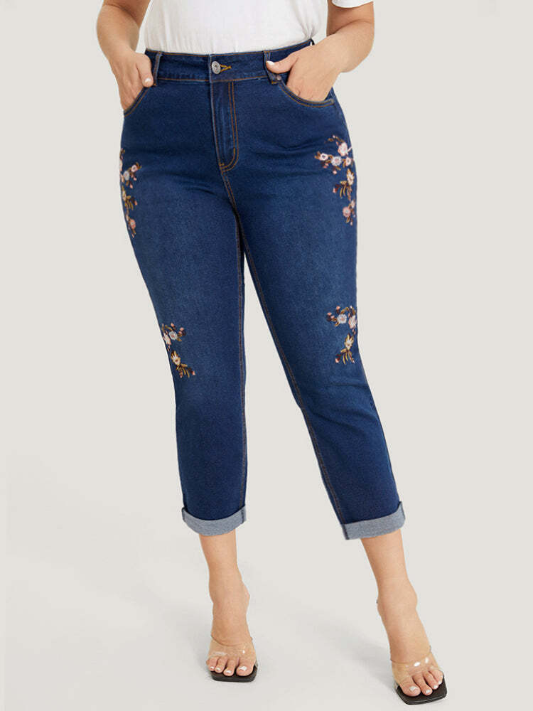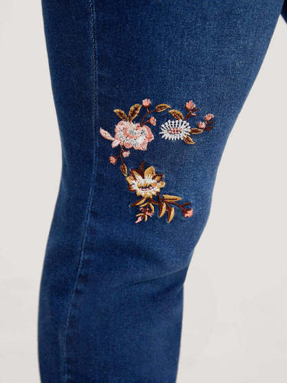 Straight Leg Very Stretchy Dark Wash Floral Embroidered Jeans