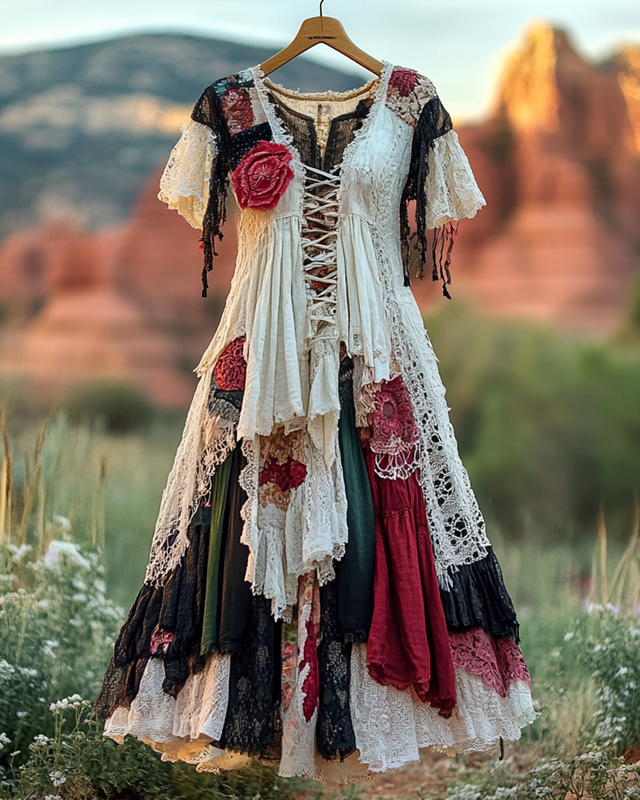 Summer Vintage Floral Lace Patchwork Dress b55f