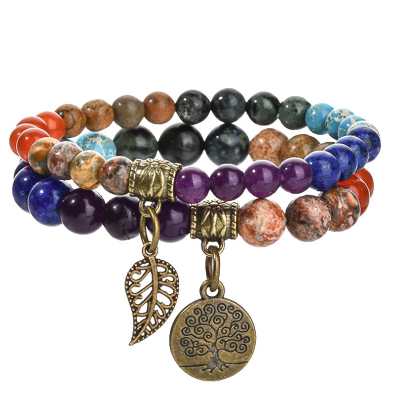 Tree Of Life & Leaf Pendant Colorful Agate Bracelet