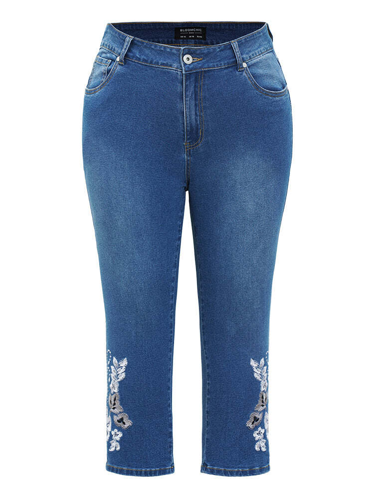 Very Stretchy High Rise Medium Wash Embroidered Cropped Jeans