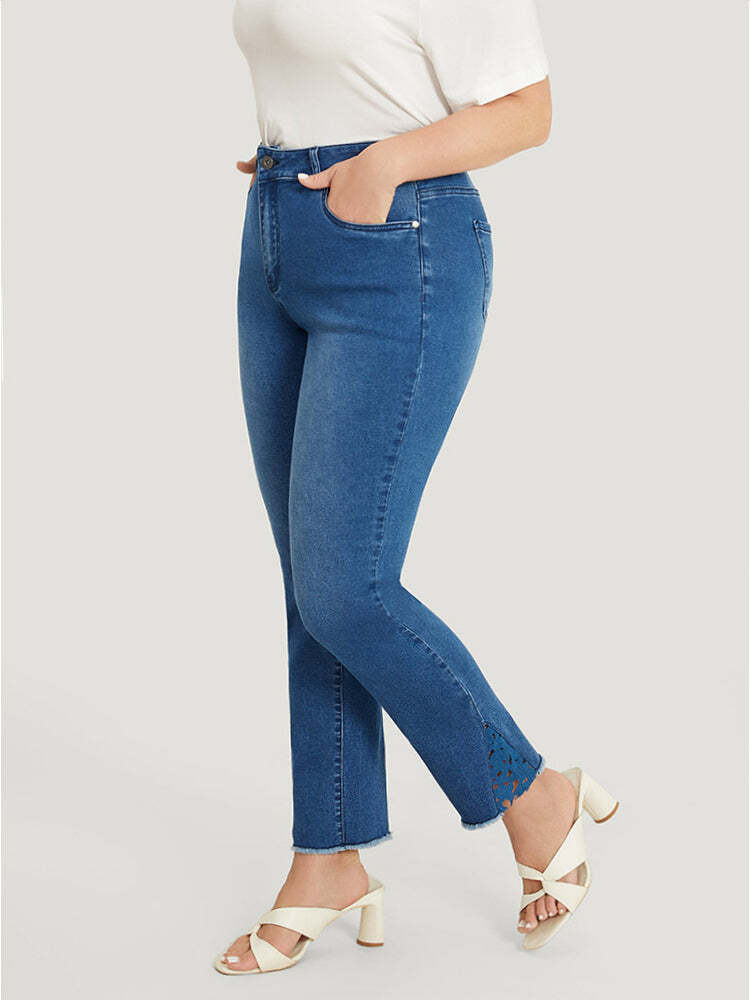 Very Stretchy High Rise Medium Wash Lace Insert Raw Hem Jeans