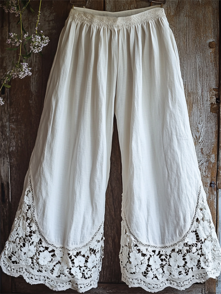Vintage Boho Floral Lace Hem Wide Leg Linen Pants