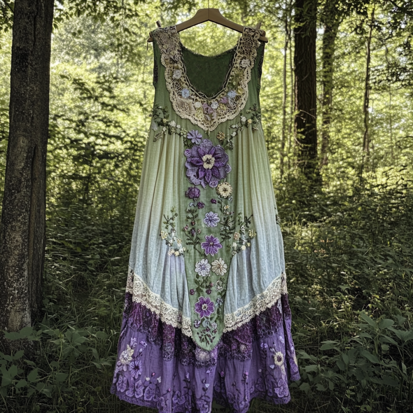 Vintage Boho Lavender Art Linen Patchwork Art Linen Tank Dress