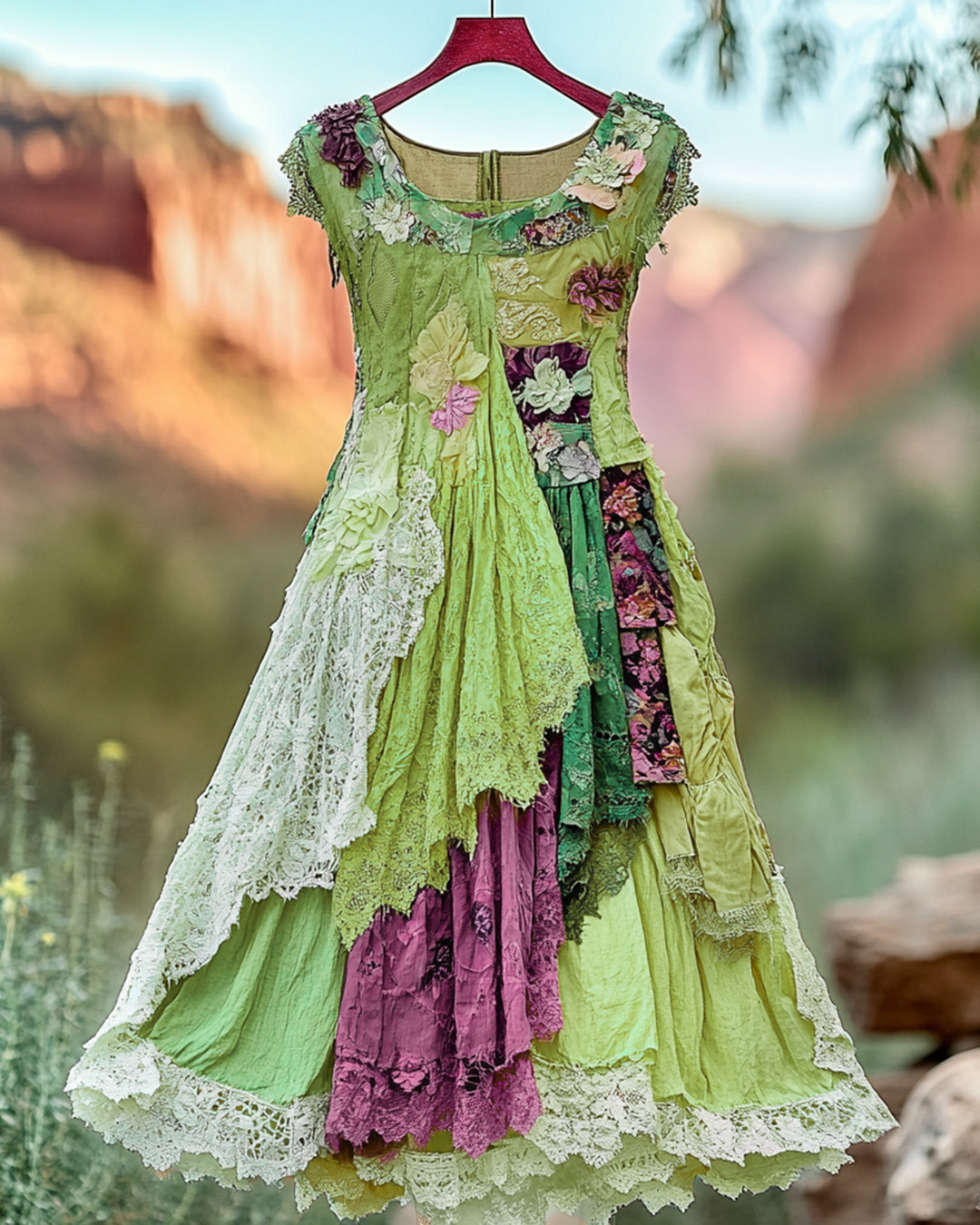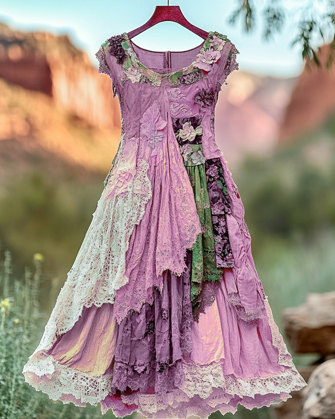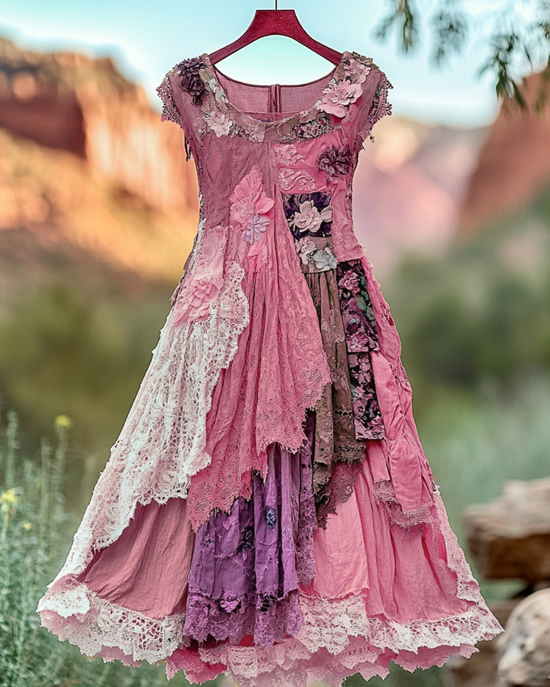 Vintage Floral Embroidered Lace Patchwork Dress b034