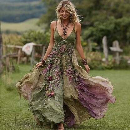Vintage Floral Embroidery Linen Maxi Dress