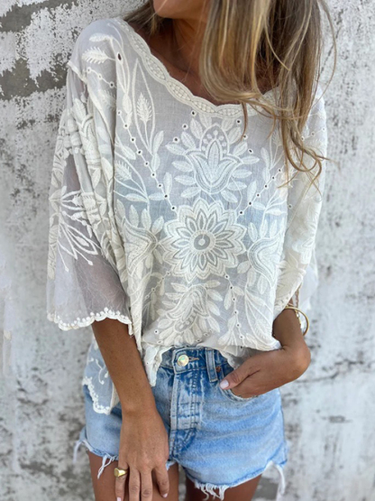 Vintage Floral Lace Embroidery Art Linen Blend Tunic