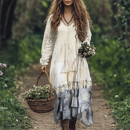 Vintage Floral Lace Layered Flowy Linen Blend Maxi Dress