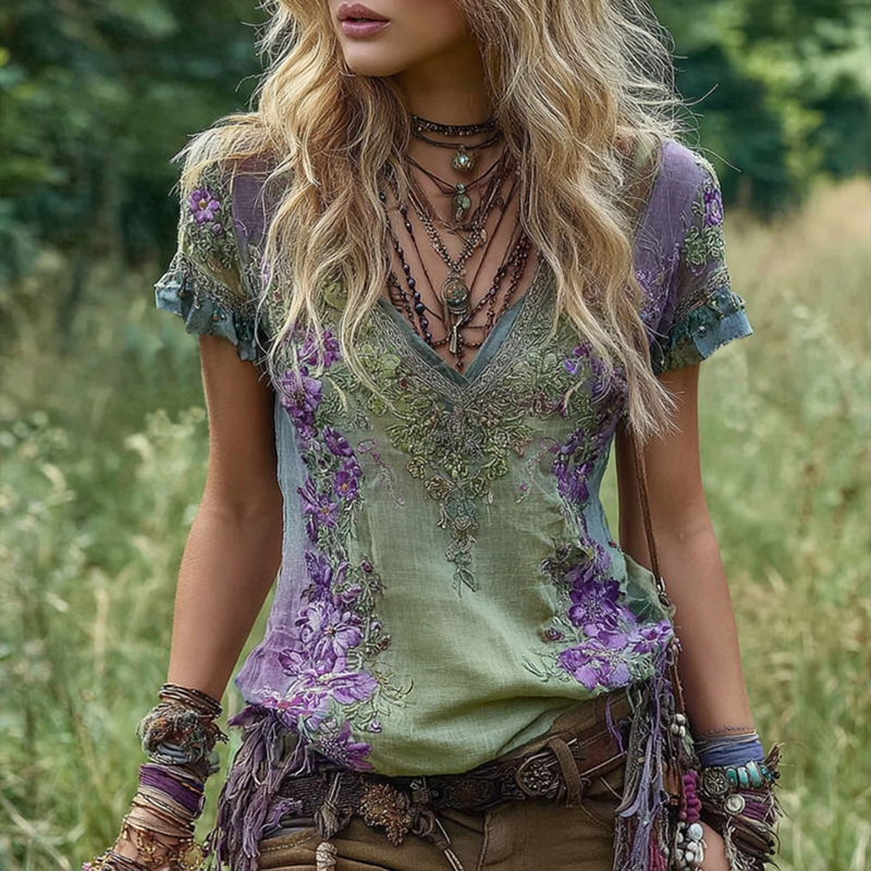 Vintage Flower Embroidery Linen V-neck Short Sleeve T-shirt