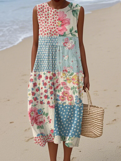 Vintage Loose Floral Patchwork Art Linen Tank Dress