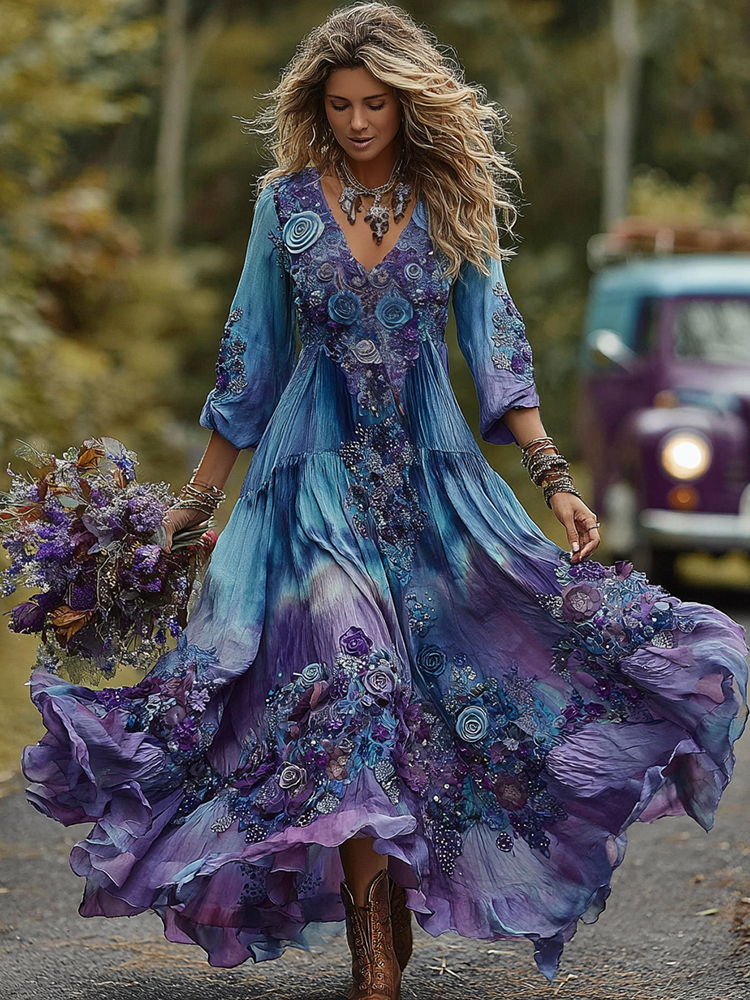 Vintage Purple And Blue Lavender Patchwork And Floral Embroidered Art Linen Maxi Dress