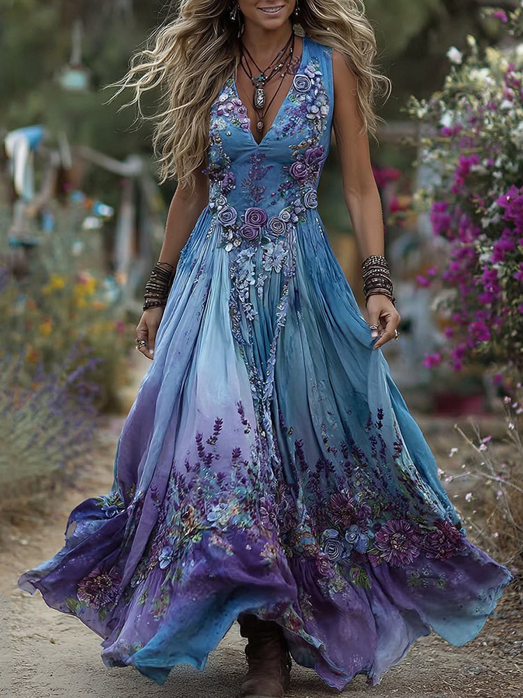 Vintage Purple And Blue Lavender Patchwork And Floral Embroidered Art Linen Sleeveless V Neck Maxi Dress