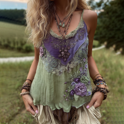 Vintage Purple Lavender And Floral Embroidered Linen V-neck Camisole