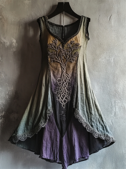 Vintage Tree Of Life Lace Hem Gradient Linen Dress