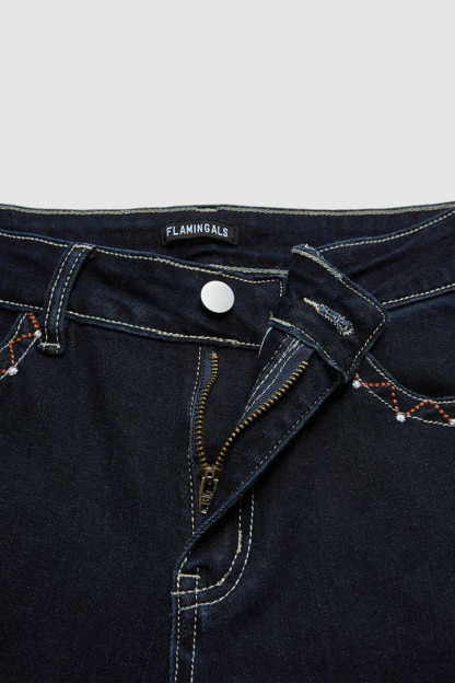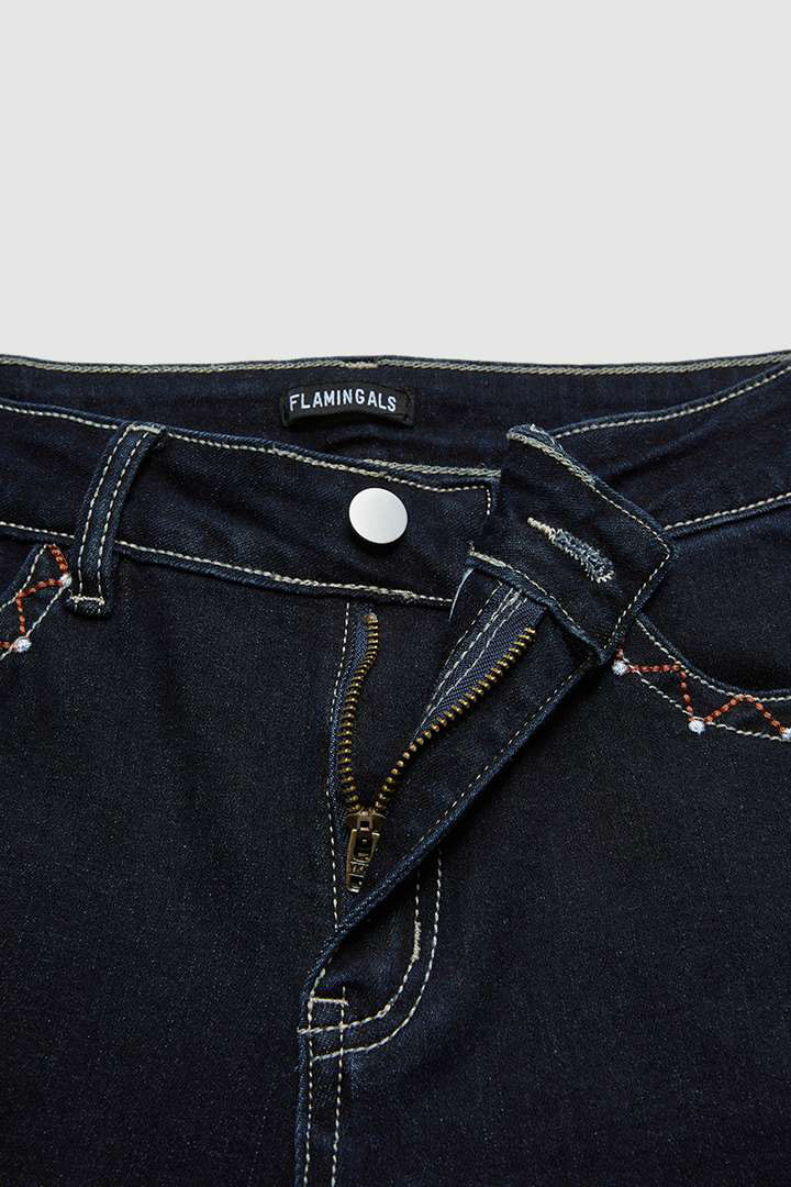 Rhinestone design features the use of small, sparkling, faux gemstones typically made of glass or crystal, adding a glamorous and dazzling element to clothing; Button design makes it more fun and vertical; Embroidery, the artful technique of decorating fabric, transforms garment into unique pieces of wearable art and enhances textiles with creativity; Real pocket for practicality; Stitch as the specific sewing technique creates decorative elements that contribute to the overall design of garments; Washed material makes it look vintage and easy on the eyes; Zipper allows for a secure closure when engaged and a smooth release when disengaged and sometimes serves as a stylish nod to modern aesthetics and a dynamic feature on graments