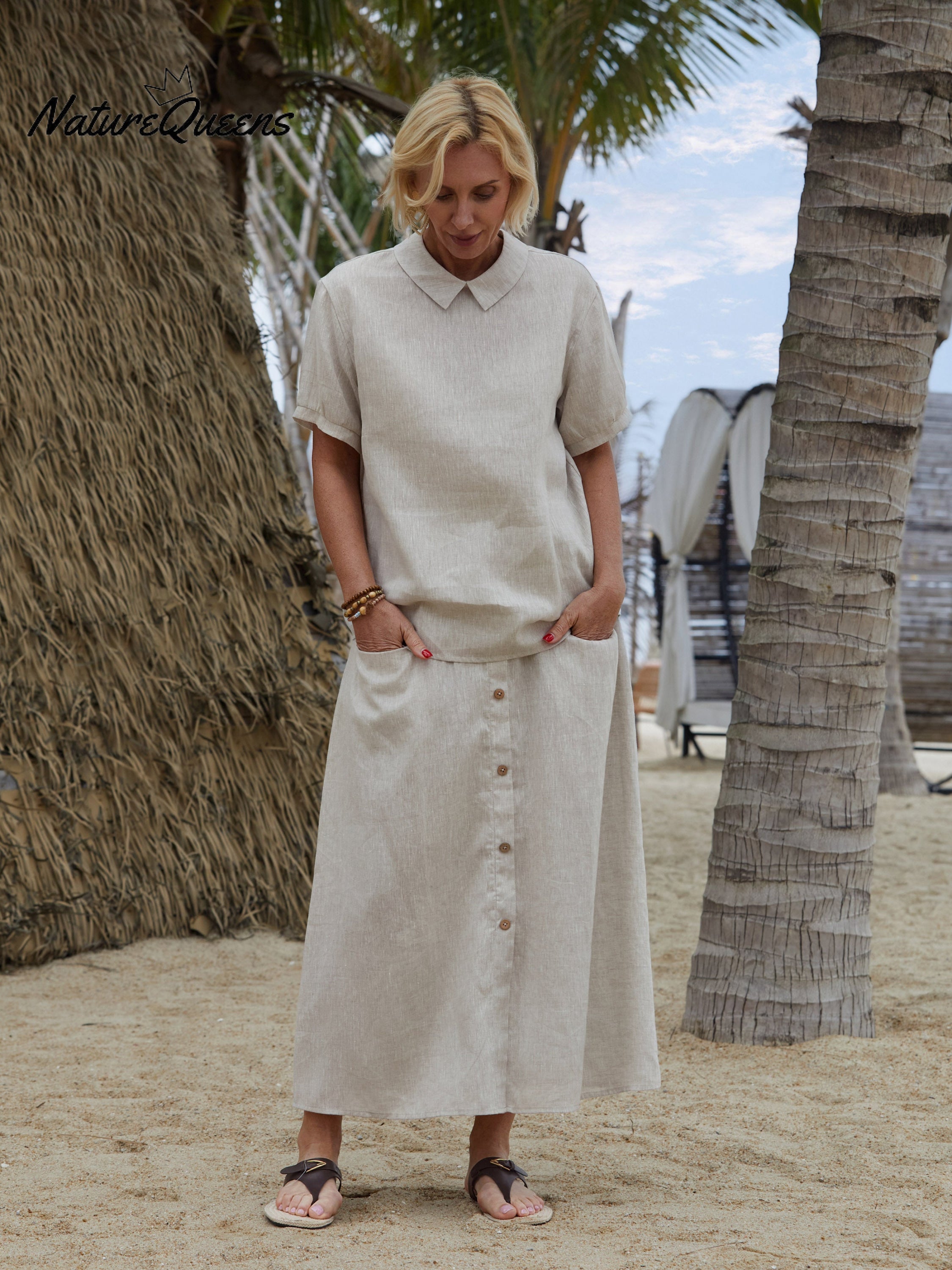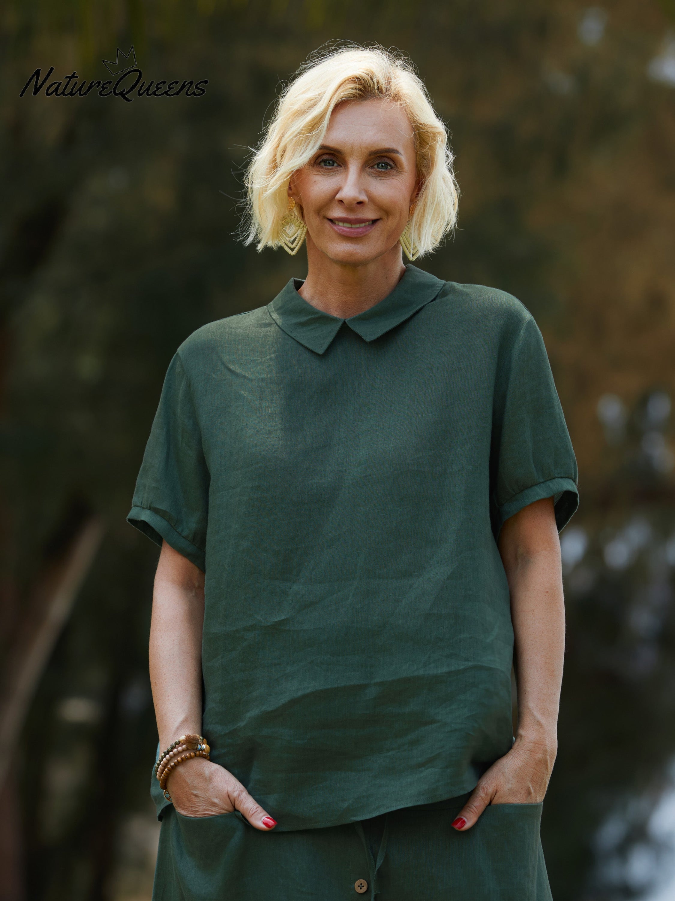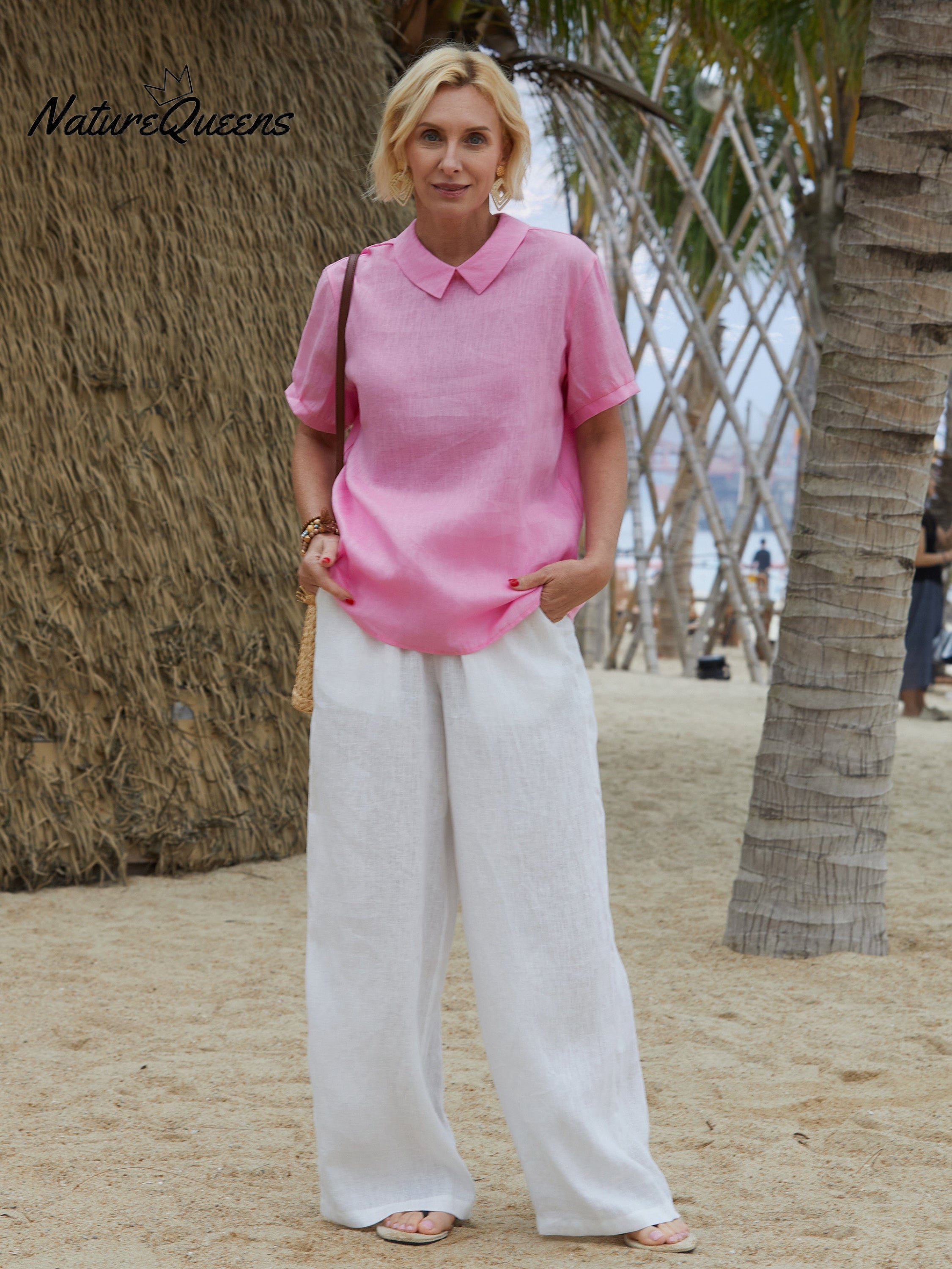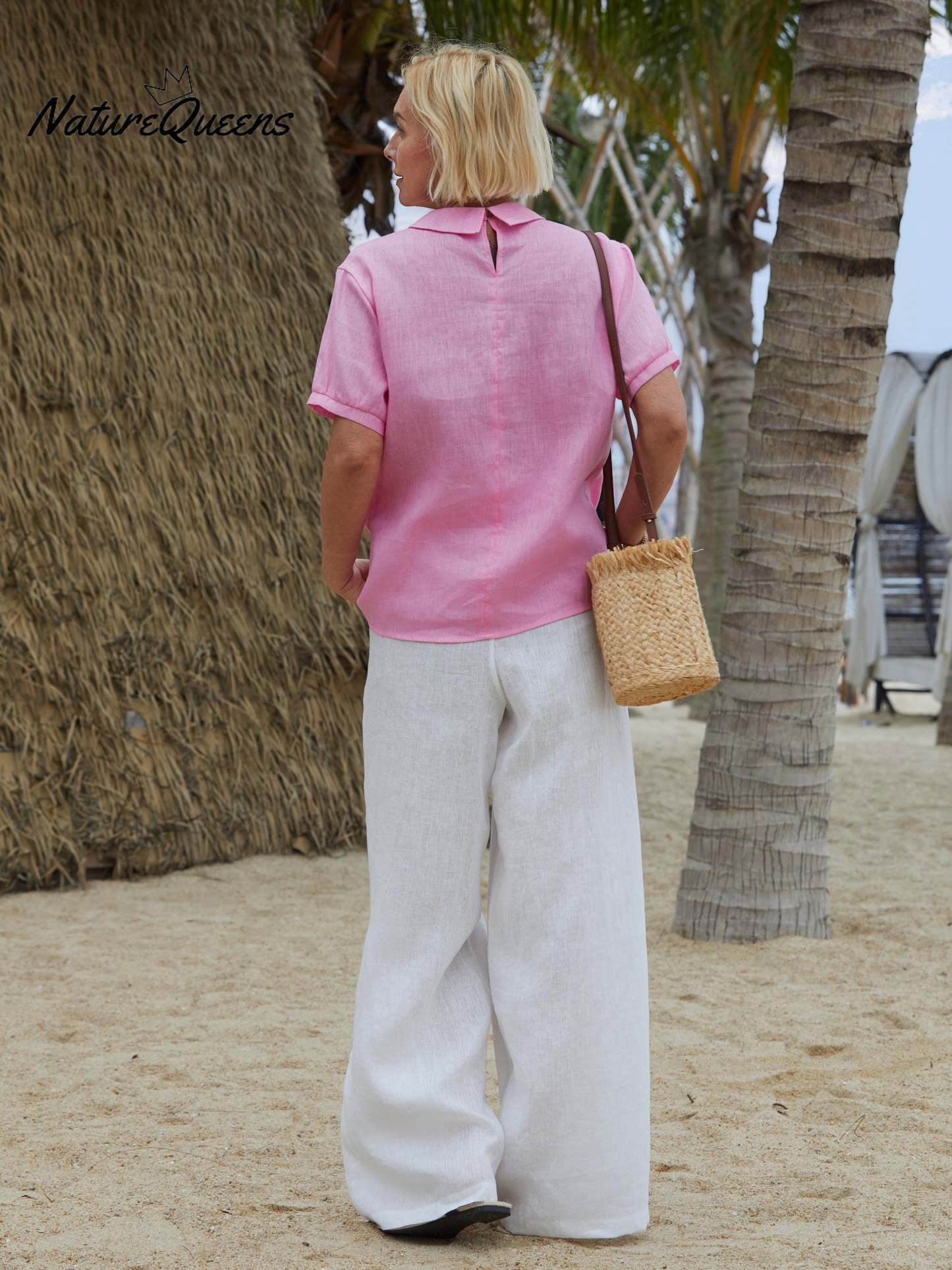 Refined simplicity meets breathable comfort in this 100% pure linen top, perfect for warm-weather layering. Featuring a clean, tailored silhouette with a delicate Peter Pan collar, this blouse adds a soft, feminine touch to your everyday wardrobe. The natural linen texture offers both lightweight ease and timeless charm, making it ideal for relaxed outings, vacation days, or casual office wear. Pair it effortlessly with matching linen trousers or denim for a chic, effortless look.