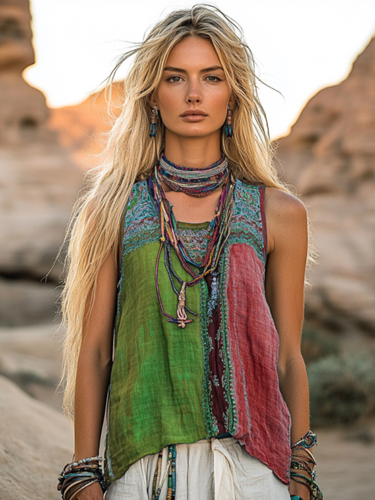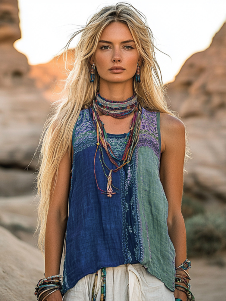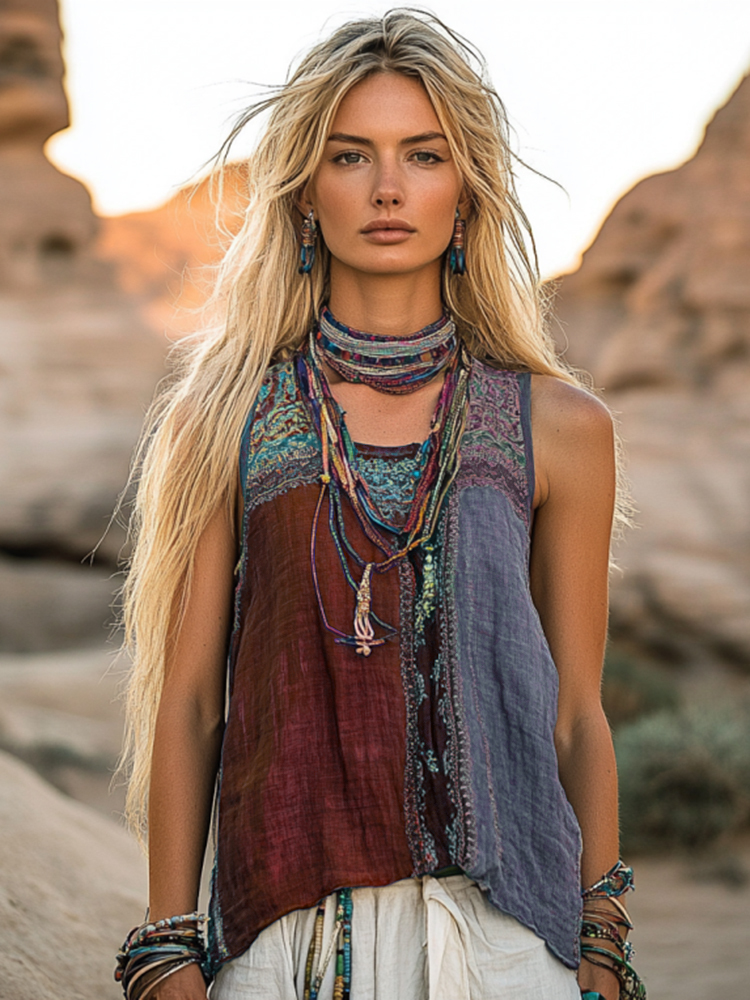 Women's Bohemia Ethnic Patchwork Style Linen Sleeveless Top