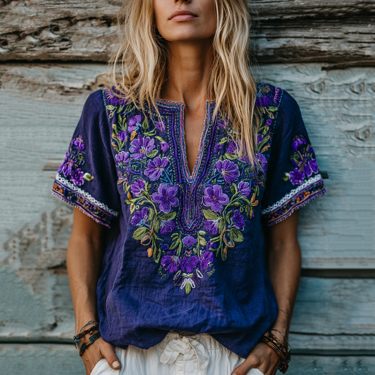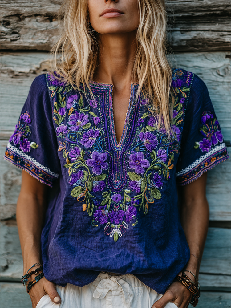 Women's Floral Embroidery Art Linen V-neck Shirt