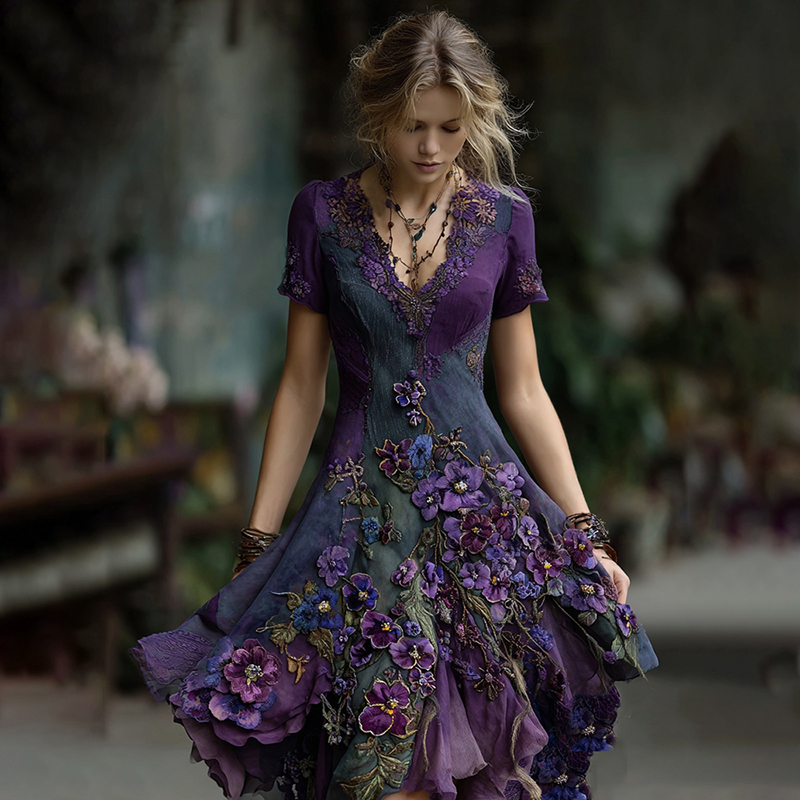 Women's Retro Embroidered Pansy Flowers Short-sleeved Midi Dress
