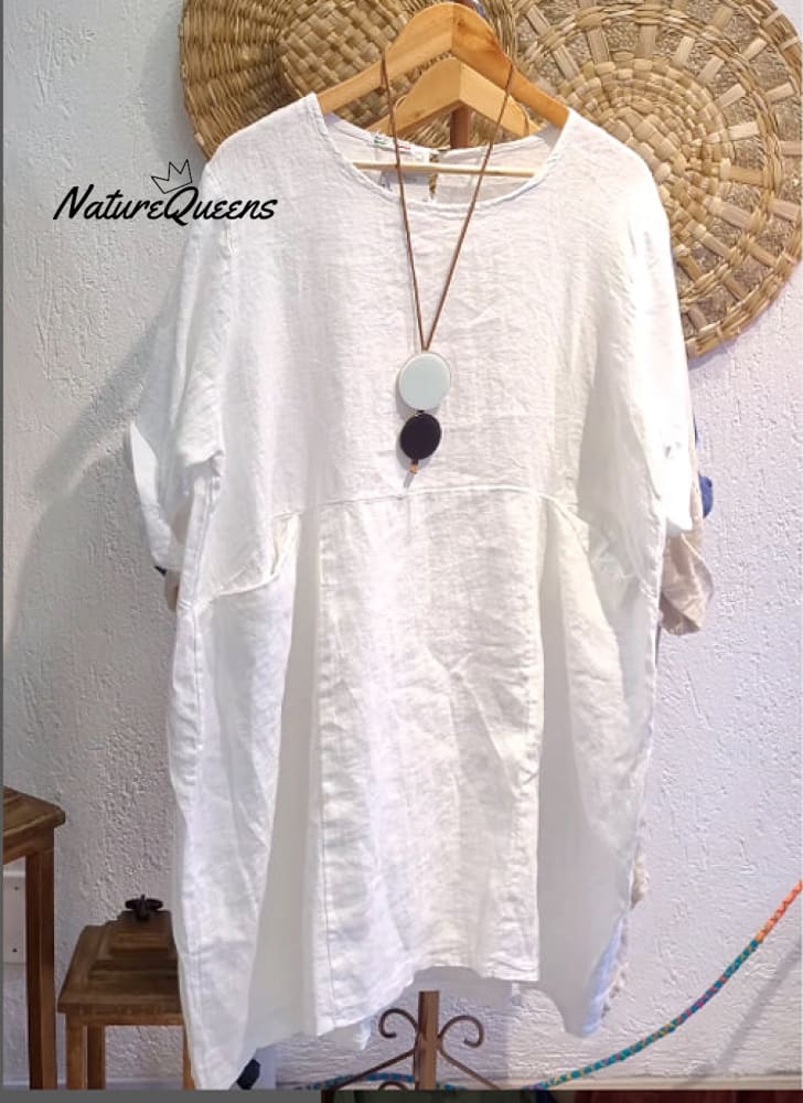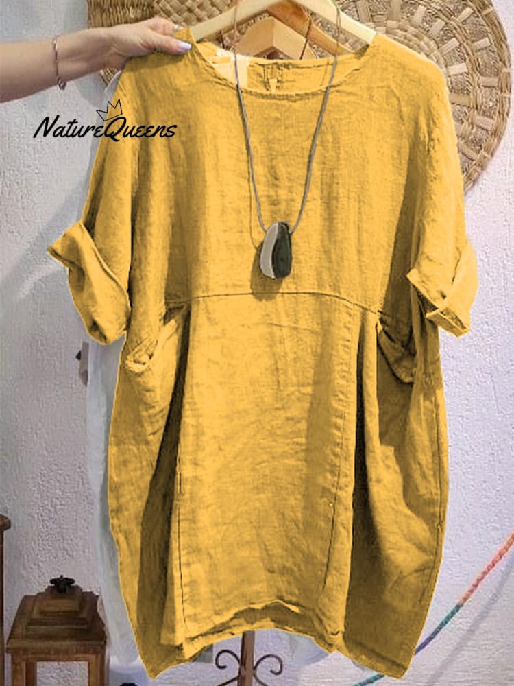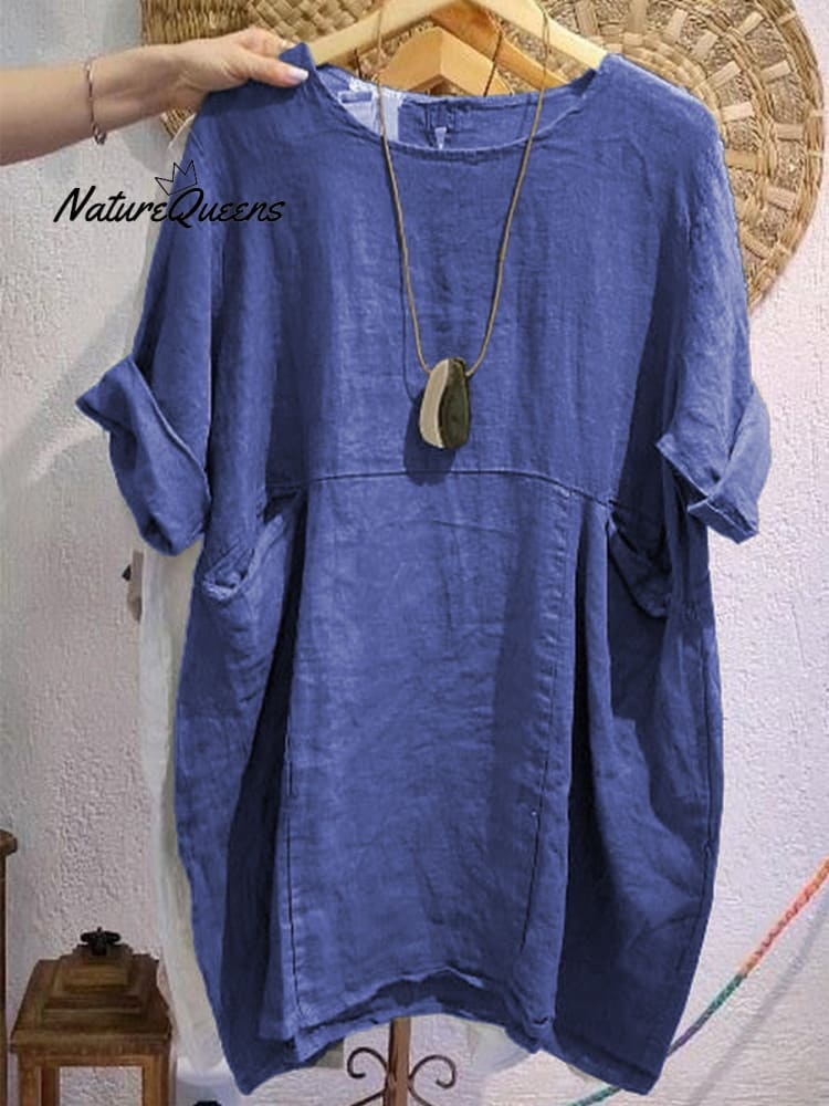 Gender: For WomenStyle: CasualFit Type:FItShirt Length: RegularSleeves Length: short SleeveCollar: Round CollarMaterial: 70%Cotton+30%LinenMaterial Stretch: No StretchPocket :side poctketWeight: 0.300kgPackage: 1 x Dress