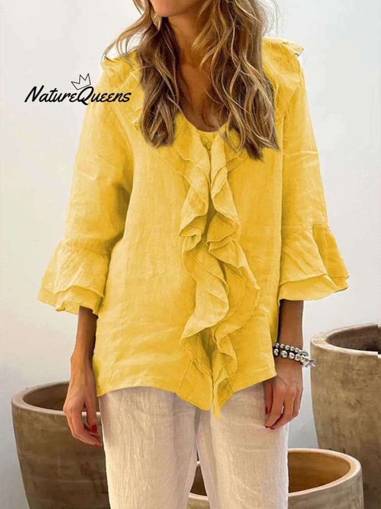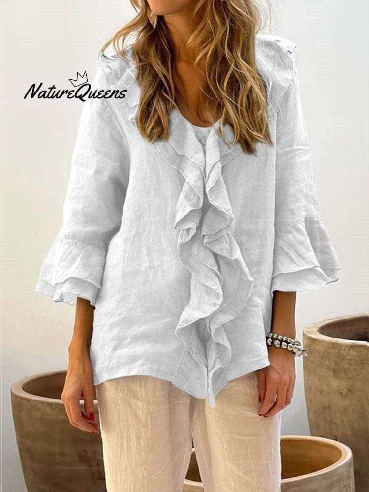 Women's Ruffles Casual Cotton And Linen 3/4 Sleeves Shirt