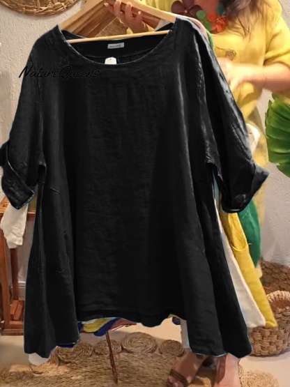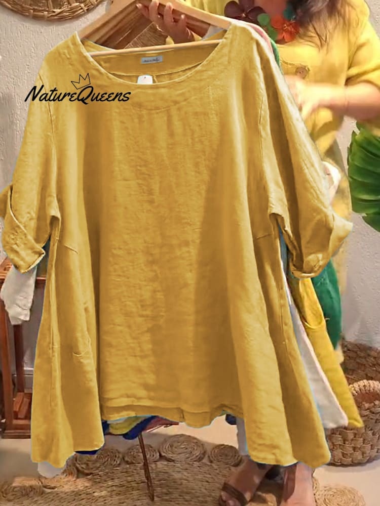 Women's Solid Color Round Neck Half Sleeves Casual Loose Pocket Linen Tops