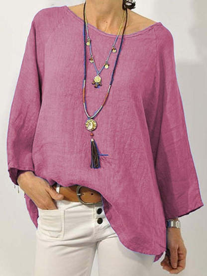 Women's Solid Colour Cotton And Linen Round Neck Ninth Sleeve Blouse