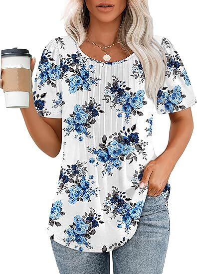 - 🌹Great Features: t shirts for women loose fit,womens tops dressy casual,adorable pleated front design,scooped neck short sleeve blouses for women,cute summer tops with curved hem,available in floral and solid colors