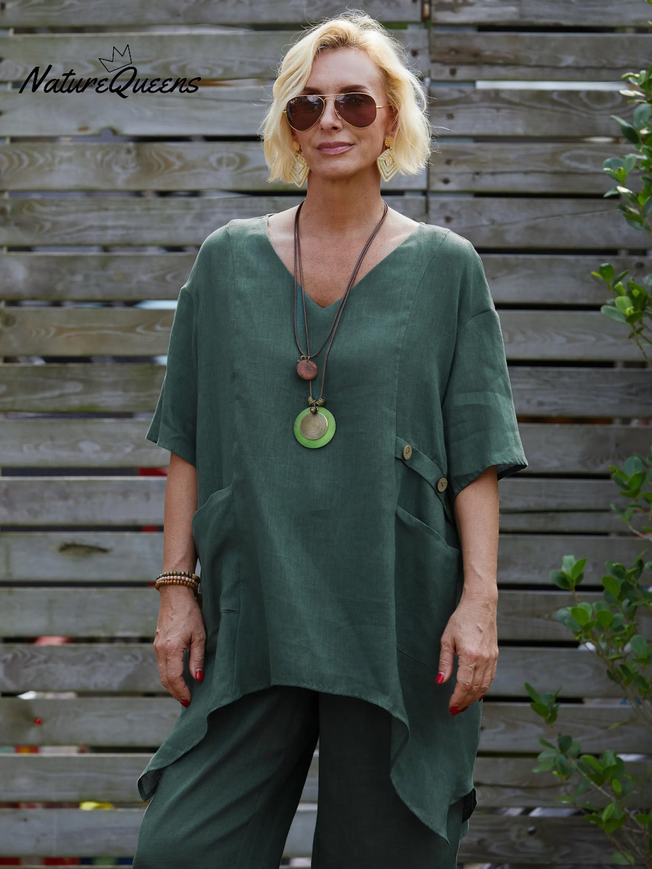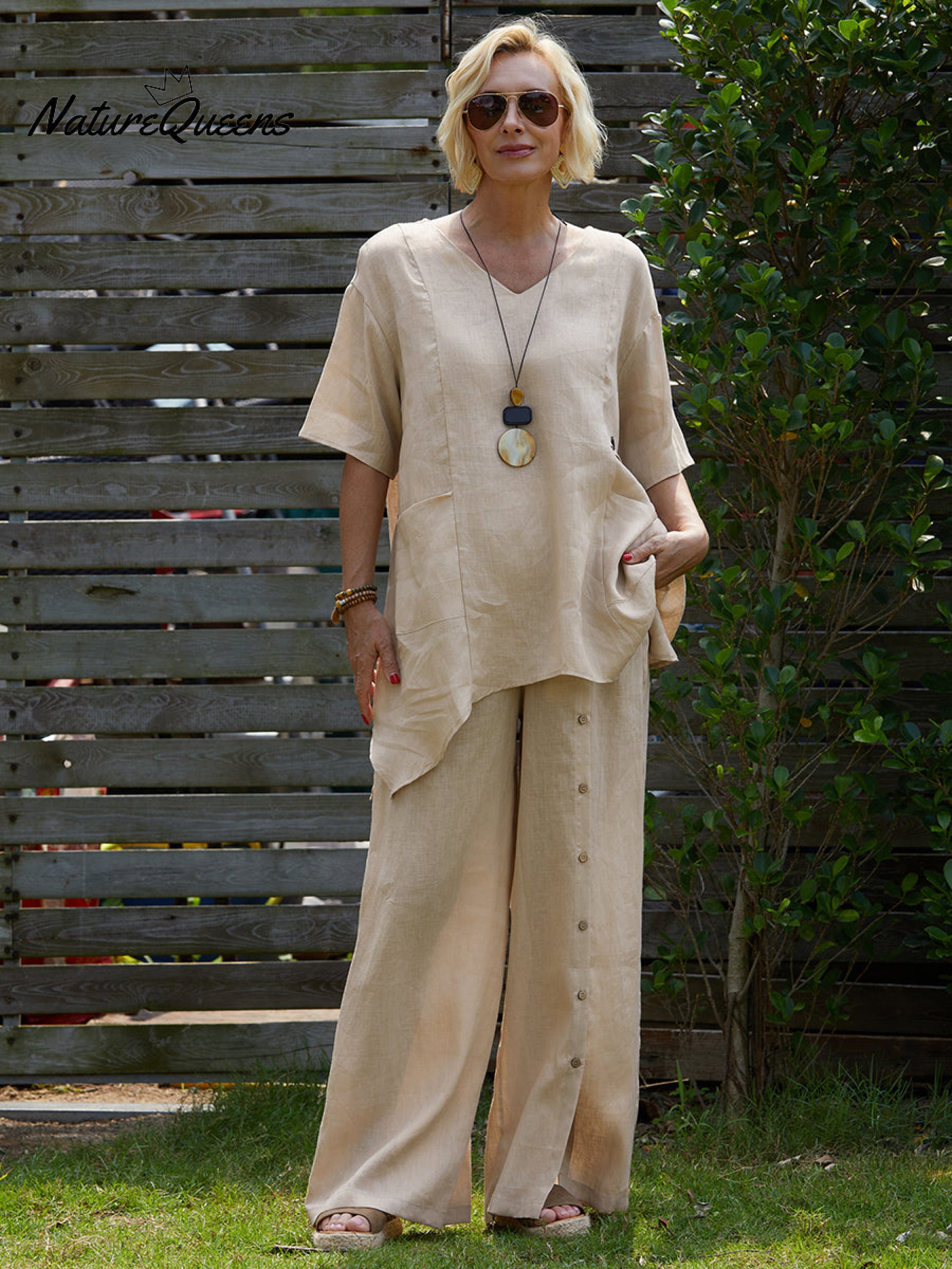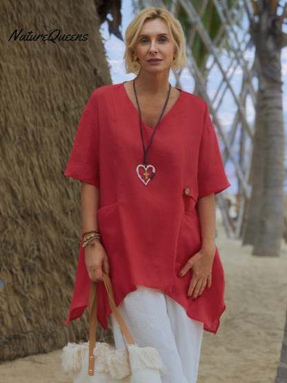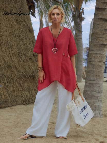 100% Linen V-Neck Top with Decorative Side Buttons